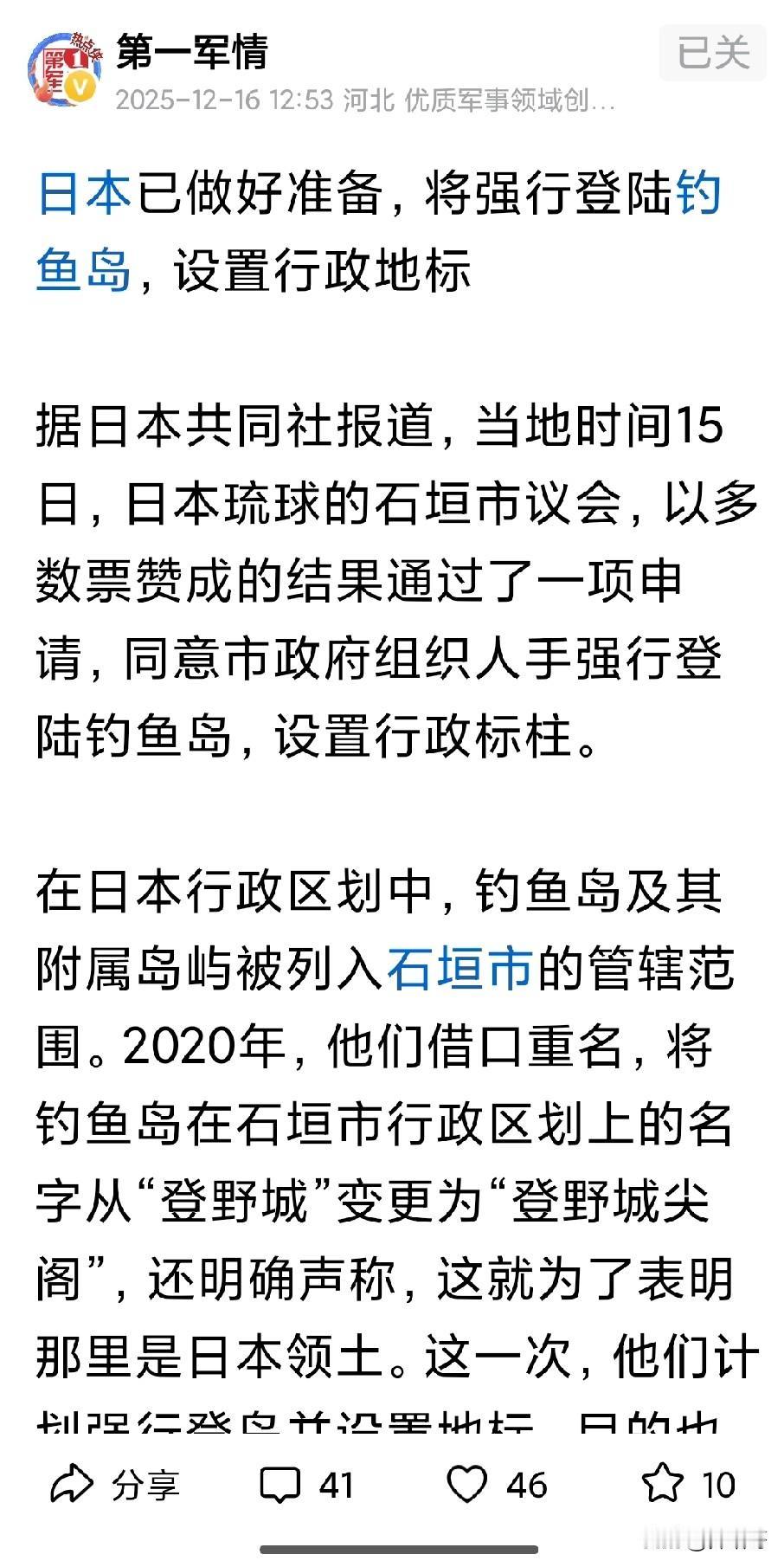 这日本地方政府是想狗急跳墙?想在钓鱼岛设置行政标志?这个举动明显就是在对接下来直接冲突做压力测试,看看东大的反应,我们的海警部队水炮严正以待,就目前的情况来看,日本右翼可能真的会组织船只进行强闯,疼击他们才是最好的回应。