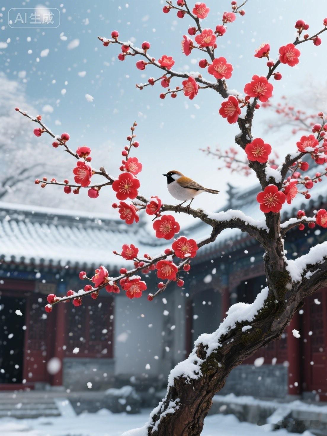 雪落红梅间,古道入画来。红梅迎冬雪 傲雪寒梅花开 雪梅风景