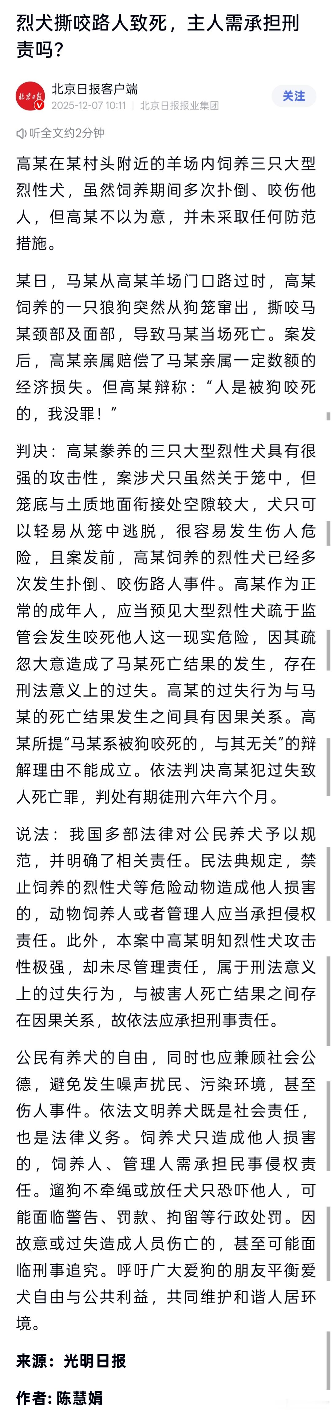这个案子的判决,我认为是有问题的。大家看报道。被告饲养的是三只大型烈性犬,且在饲养期间有过多次扑倒、咬伤他人的举动,但被告却不以为意,拒绝采取任何防范措施。后有路人在其羊场门口经过时,被其饲养的狼狗咬伤面部及颈部,当场身亡。这明显不是疏忽大意的过失,而是刑法意义上的危害公众安全。判决不能只看损害结果,要综合损害过程一起看。对于被告触犯的罪名,我更倾向于是以危险方法危害公共安全罪。鉴于已经致人死亡,本案的量刑应该自10年起步,最高死刑。现在只以过失致人死亡罪,判处被告有期徒刑6年半,量刑畸轻。实务案例看一看