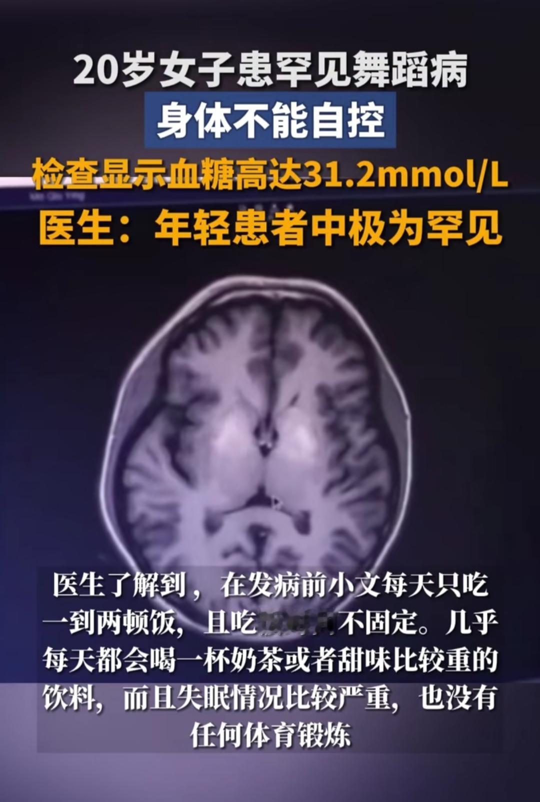 20岁姑娘突然“跳舞”停不下来,不是天赋觉醒,竟是糖尿病并发症找上门!血糖飙到31.2mmol/L,肢体不受控扭动,想想都让人揪心。 这姑娘是深圳餐厅服务员,平时吃饭凑活、奶茶当水喝,熬夜更是家常便饭。谁能想到,这些年轻人习以为常的生活习惯,竟把身体逼到了绝境。医生说这种舞蹈病本是老年患者的罕见症状,现在却盯上了年轻人,实在让人警醒。 我们总仗着年轻肆意消耗,觉得病痛离自己很远。可身体从不会惯着坏毛病,奶茶里的糖、熬不完的夜、凑活的三餐,终会变成健康的“负债”。年轻不是挥霍的资本,而是好好爱惜身体的起点。 别等疾病找上门才追悔莫及,规律吃饭、少喝甜饮、早点睡觉,这些简单的小事,才是守护健康最实在的方式。愿我们都能听懂身体的信号,别让一时的放纵,透支了一辈子的幸福。