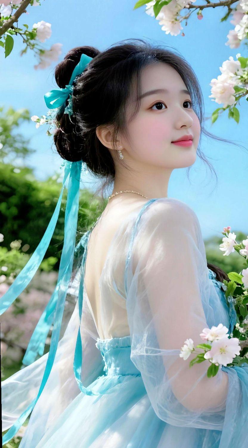 阳光洒落,树影婆娑,少女漫步在林间小道。