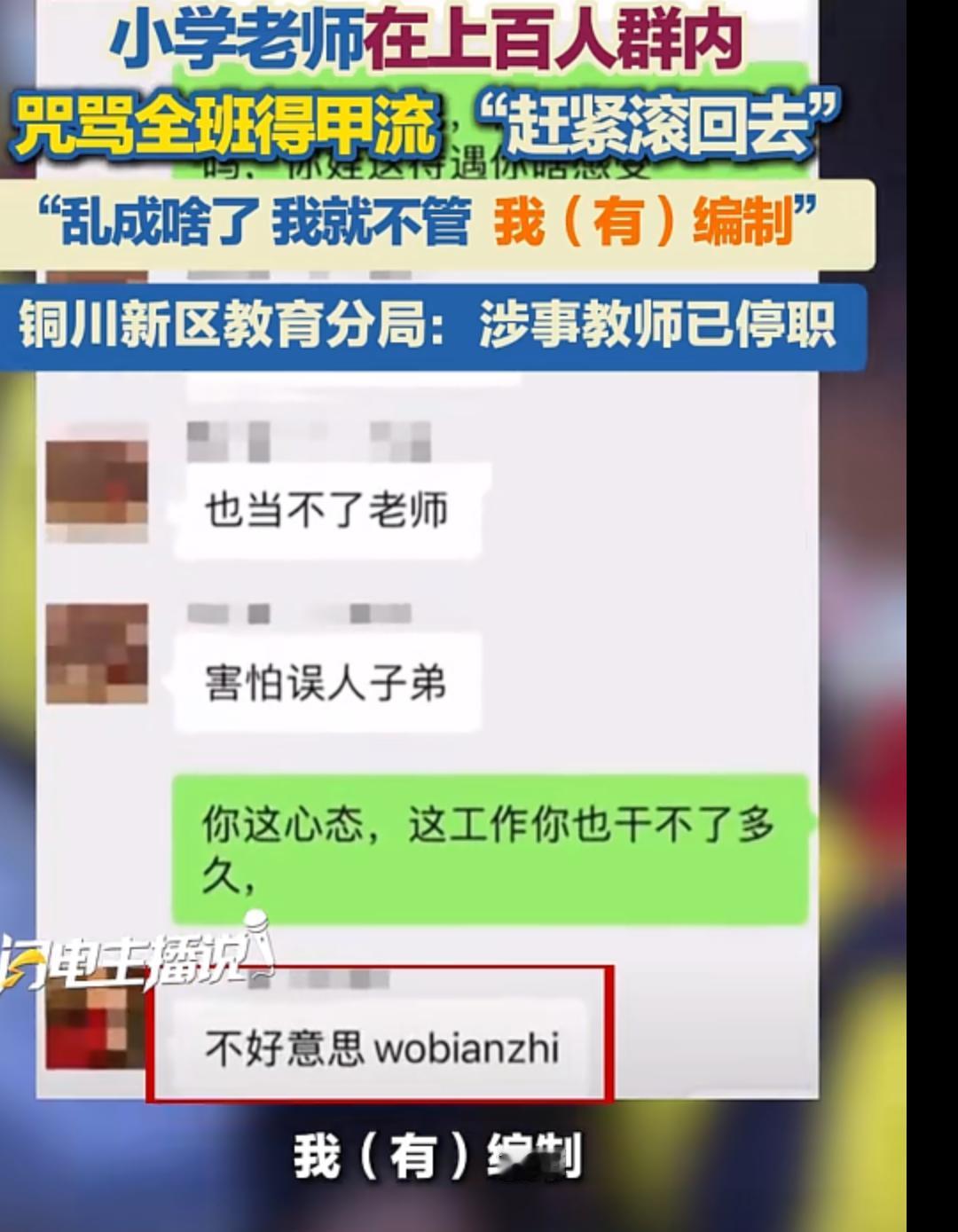 编制不是师德败坏的挡箭牌!一句“wobianzhi”,暴露的何止是职业摆烂,更是对教育的亵渎。咒骂学生得甲流、喊着“滚回去”,拿着编制就无视责任,这样的老师连基本的做人底线都没有,何谈教书育人?三尺讲台容不下这般冷漠与恶意,停职只是开始,师德考核绝不能形同虚设