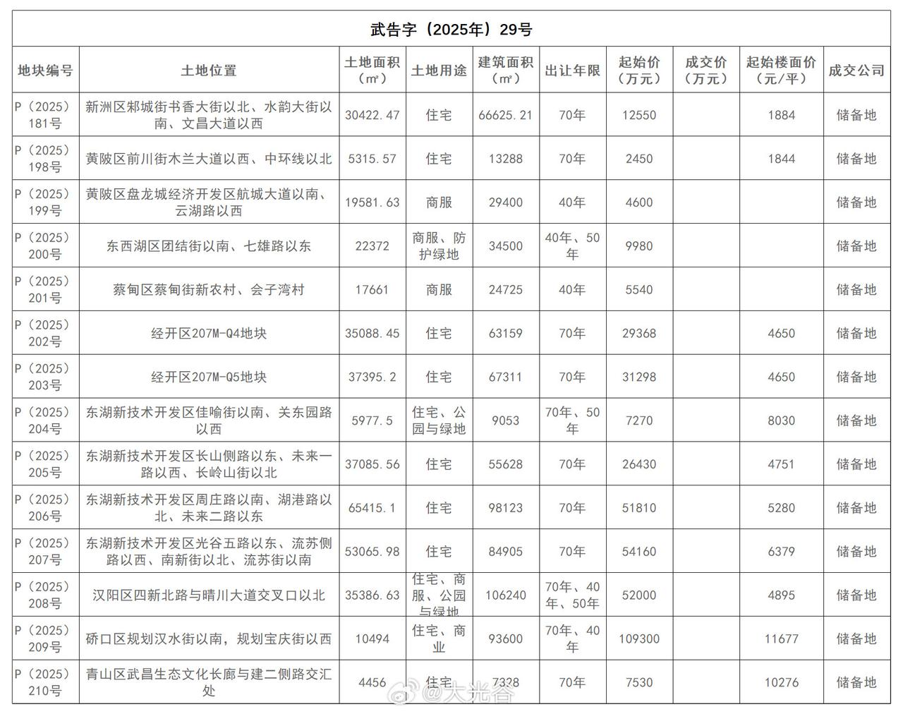 关东街道1宗住宅用地挂牌 11月27日,进一步盘活闲置低效存量土地,化解房地产市场风险,助企纾困,加快化解地方融资平台债务风险,化解金融风险,保障房地产市场平稳健康发展。武汉市自然资源和城乡建设局决定以拍卖方式出让14宗地块的国有建设用地使用权,发布武汉市拍卖出让国有建设用地使用权公告 武告字(2025年)29号。本次拍卖出让地块网上拍卖时间为2025年12月18日9时30分起。 其中,P(2025)204号地块位于东湖新技术开发区佳喻街以南、关东园路以西(具体位置及四至见本拍卖文件附图所示)。地块规划总用地面积5977.5平方米(以实测为准)。规划用地性质为居住用地、防护绿地。国有建设用地使用权出让年限为70年、50年。