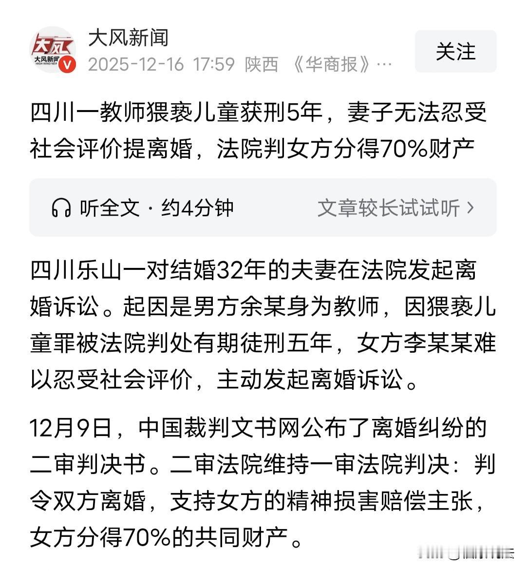 四川乐山,女子的丈夫是教师,因猥亵儿童罪被判5年有期徒刑,这事一出,社会上一片骂声,女子实在受不了,女儿也情绪低落,日子简直过不下去,而且,她担心女儿以后找对象,找工作都受此影响,更让女子心寒的是丈夫丝毫不知悔改,于是,女子告上法院,要求与丈夫离婚,并让丈夫赔偿精神损失费,法院一审、二审这样判了。 李女士和丈夫余某,在1993年结婚,两人风风雨雨过了32年,可到头来日子过不下去了。 丈夫余某本来是个教师,本应教书育人,关爱学生,以身作则,结果他却干出了猥亵儿童的缺德事。 在2025年4月,余某被判处有期徒刑5年,而且,从刑罚执行完或者假释那天起,一辈子都不能再从事跟未成年密切接触的工作了。 这处罚真是大快人心,像余某这种人就不该在接触孩子。 这事一曝光,社会上那是骂声一片啊,多难听的话都不足为奇,毕竟余某做的事令人发指。 然而,余某的妻子李女士和女儿却受到了殃及,她实在是受不了,觉得这日子简直没法过了。 不仅出门被人指指点点,生活也笼罩在丈夫带来的阴影之下。 李女士作为过来人对这事都忍受不了,更别提年轻的女儿了,让她担心的是因为父亲的行为,女儿心理受到了巨大的伤害,父亲没有做到一个好榜样,给她带来的都是无尽的伤害。 看到女儿情绪一直低落,李女士心里一边恨丈夫无耻,一边心疼女儿。 而且,她还担心这事对女儿以后找对象,成家,找工作都会有不可磨灭的影响。 试想,哪个家庭愿意跟有这样父亲的人家成为亲家?找工作人家要是知道这事难免不被影响,让人指指点点,余某带来坏影响往严重了说,是会伴随女儿一生的。 不光这一点,李女士对丈夫的行为也感到心寒,丈夫出事后,她忙前忙后的给他处理刑事诉讼,身心俱疲。 可余某呢,出事这几年下来,对猥亵儿童这事儿一点悔改的意思都没有。 李女士对二人的婚姻灰心丧气,这个家根本看不到未来,夫妻感情早就不复存在了! 为了女儿的将来,李女士将丈夫余某起诉到法院,要求离婚,并要求余某赔偿自己精神损失费。 开庭时,李女士就说了,想离婚就是因为余某犯的事。 不过,离婚得分割夫妻共同财产,李女士说当初他们为了女儿曾在成都买房,一起和亲戚借了5万块钱。 另外,余某出事后请律师,李女士又和亲戚借了1万块钱当做律师费。 所以,李女士认为这两笔钱都算夫妻共同债务。 本案中,购房借款5万元,用于为女儿购买房产,属于为家庭共同利益所负债务,符合“家庭日常生活需要”的范围,应认定为夫妻共同债务,李女士需承担还款责任。 但李女士为丈夫借的1万律师费,算不算夫妻共同债务呢? 《民法典》第1064条,夫妻双方共同签名或者夫妻一方事后追认等共同意思表示所负的债务,以及夫妻一方在婚姻关系存续期间以个人名义为家庭日常生活需要所负的债务,属于夫妻共同债务。 律师费1万元虽用于余某刑事辩护,但婚姻关系存续期间,一方因犯罪行为产生的法律费用通常不被视为家庭共同生活所需。 然而,若李女士在借款时知情或事后追认则可能被认定为共同债务。本案中,法院未明确排除该债务的共同性质,因此李女士仍需承担还款责任。 李女士和余某在乐山还有一套房子,但是,房子值多少钱,两人还没有商定一致,她也没有申请评估,所以,打算另案主张处理。 所以,一审法院就没管这套房子和里面的家具、家电。 另外,他们还有一套房子拆迁得了43万多拆迁款,李女士也打算另外处理。因此,法院也没管。 一审法院认为,李女士作为无过错方,在离婚时应该多分财产。 本案中,余某因犯罪行为导致婚姻破裂,存在重大过错,而李女士作为无过错方,且长期承受丈夫犯罪带来的压力,她要面对舆论谴责、还有子女的心理问题等。 因此,一审法院认为,余某的行为违背公序良俗,且存在重大过错,同时也给李女士造成了较大的精神伤害。 根据《民法典》“照顾无过错方”的原则,法院在分割财产时向李女士倾斜。 因此,一审法院判决:李女士分70%的共同财产。余某的银行存款、股票余额还有住房公积金这些,也都按3:7的比例分割。 一审法院判决后,余某不服,提出上诉。 二审法院认为,余某作为教师,不关爱学生,反而作出伤害儿童的犯罪行为,同时也让妻子李女士对婚姻丧失了信任,精神痛苦,夫妻感情破裂,对女儿的心理创伤也很大,所以,一审法院判决没问题。 因此,二审法院维持原判。 余某犯下大错,就该承担后果,李女士作为无辜的妻子,在婚姻中受到如此大的伤害,多分财产也是对她的一种补偿。 最后想说,多行不义必自毙,别以为犯错只是自己受惩罚,还会连累家人,到时候人财两空,后悔都来不及!