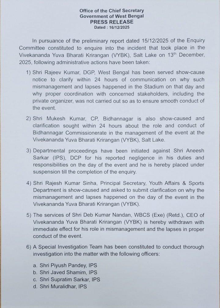 印度西孟加拉邦政府发布声明,公布了对于梅西印度行期间闹剧的处理结果,当地副警长和体育场负责人员被停职:根据2025年12月15日发布的调查委员会初步报告,针对2025年12月13日在盐湖体育场发生的事件,现已采取以下措施:1.已向西孟加拉邦警察总长库马尔发出通知,要求其在收到通知后24小时内作出说明,解释为何当天体育场出现如此严重的管理不善和疏漏,以及为何未与包括私人组织方在内的相关利益方进行妥善协调,以确保活动顺利进行。2.对于副警长阿尼什·萨尔卡失职的失控,现已启动部门调查程序,并对其实施停职处分直至调查结束。3.青年事务与体育部首席秘书辛哈被要求说明为何活动当日出现管理失当与疏漏,并提交书面解释。4.德布·库马尔·南丹,作为体育场首席执行官,因在活动管理中失当及执行疏漏中负有责任,其职务即刻予以撤销。梅西 梅西印度行
