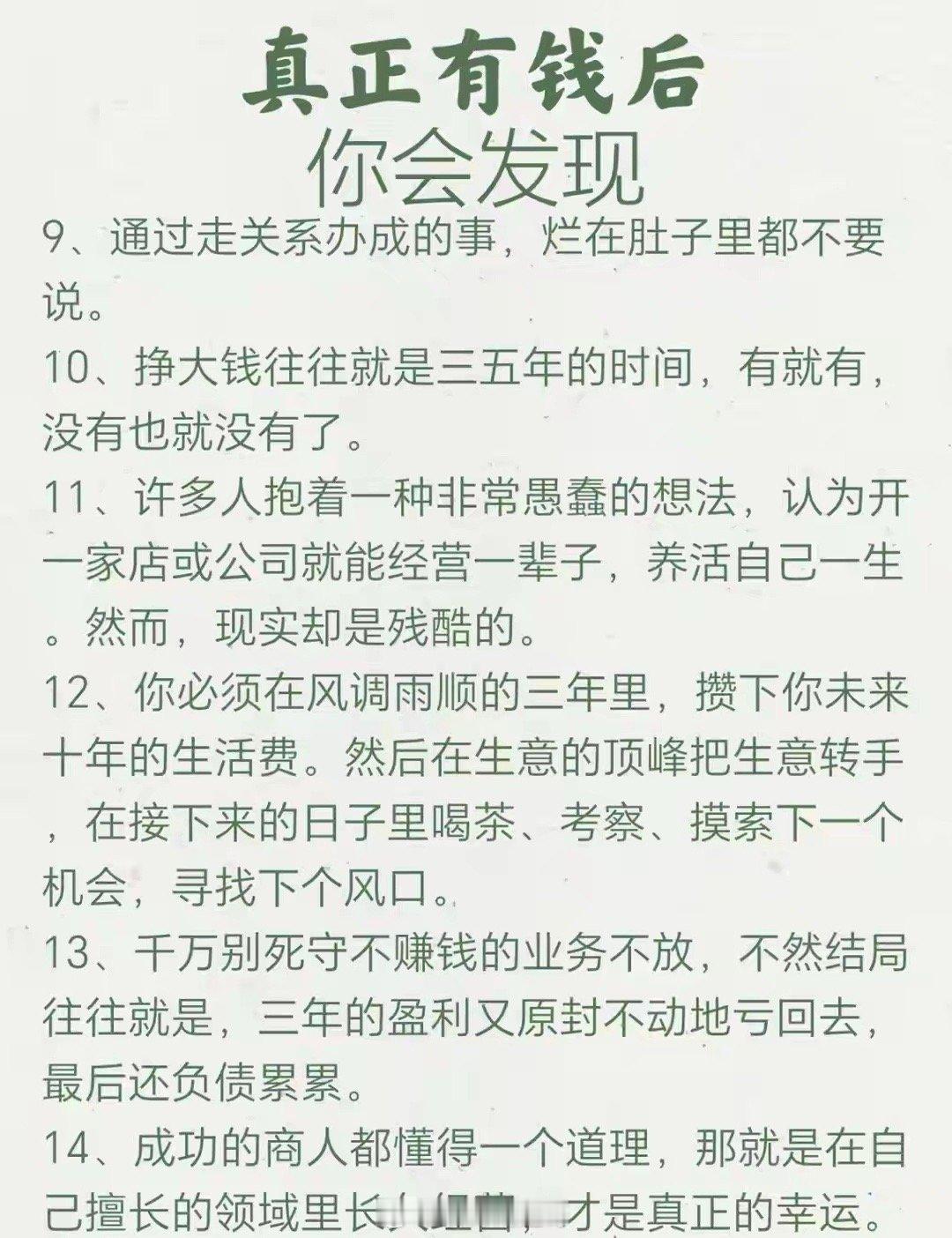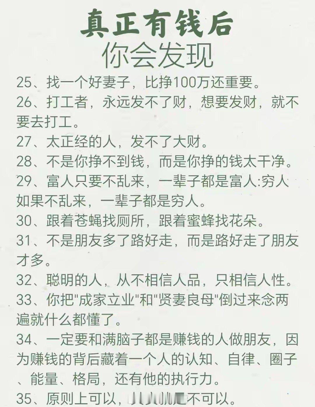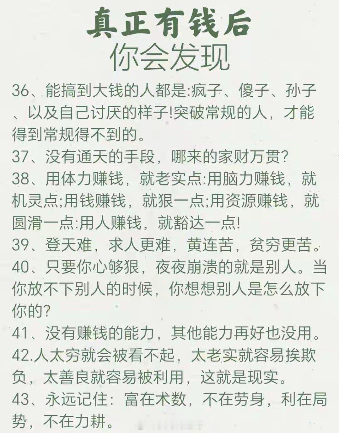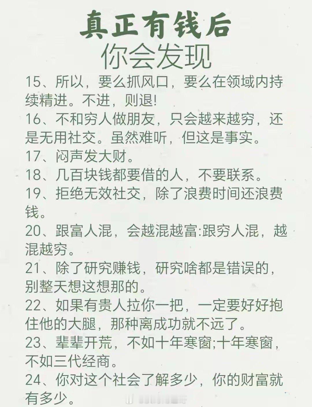 真正有钱后才懂:金钱的本质是价值交换,更是认知的变现。富人从不用时间换钱,而是靠杠杆、复利和圈层放大财富;他们懂延迟满足,更懂人性的趋利避害。金钱有灵性,只会流向敢闯、会选、能扛的人,穷富的核心差距,从来不是运气,而是看透财富逻辑的底层思维。
