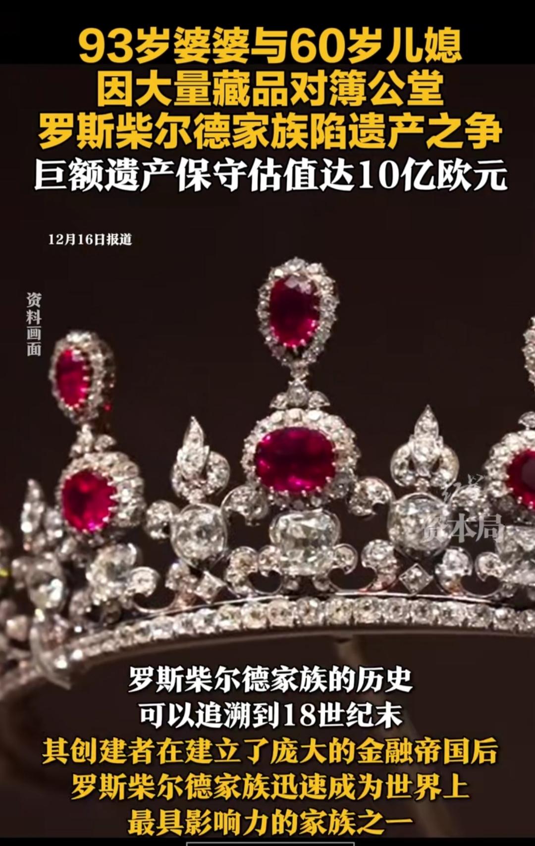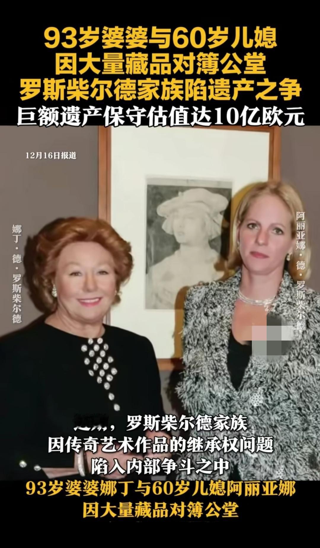坐拥百年荣光的罗斯柴尔德家族,竟因遗产问题上演婆媳反目的戏码?93岁婆婆娜丁与60岁儿媳阿丽亚娜,为价值10亿欧元的藏品对簿公堂,撕开了豪门光鲜的面纱。 这个可追溯至18世纪末的金融家族,曾建立起庞大的金融帝国,其瑞士普雷尼城堡更是藏满家具、文物与绘画,被称作“迷你卢浮宫”。家族成员埃德蒙去世前,将部分遗产赠予娜丁,其余按法律归儿子,却让婆媳因藏品继承权陷入争斗。 豪门的遗产纷争,从来都不只是金钱的较量,更是亲情与利益的拉扯。再显赫的家族,面对财富分配时,也难逃人性的考验。这场纷争最终会如何收场,也让外界看清,财富或许能堆砌荣光,却未必能守住亲情的温度。