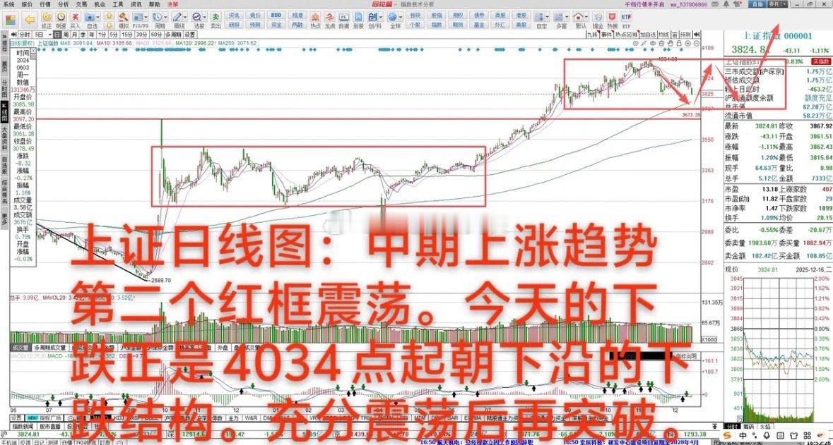 大A:中期结构还在,短期走弱 12月16日 大A下跌1.11%,中期上涨趋势宽幅震荡。短期3936点小级别下跌结构,昨天反弹上不去,有走弱迹象,今天开盘直接下探考验3816点,小创3815点新低。从3936点起至今天小级别下跌并不背驰,接下来围绕3816点小震荡,充分震荡后再创新低概率大。形成4034点日线下跌结构的3815-3936点震荡,关注这个下跌结构的止跌,大概率能再3732点上方止跌,整体继续在3732-4034点宽幅震荡。 沪深300下跌1.2%,中期上涨趋势宽幅震荡。今天直接下跌再创新低,4640点小级别下跌结构,目前并不背驰,走得比较弱,接下来小震荡后再创新低,应该不会直接跌穿4421点。 科创50下跌1.94%,中期上涨趋势宽幅震荡。今天的下跌逼近1273低点,走得不强,整体是1210-1588点宽幅震荡。短期1360点小级别下跌结构,目前不背驰,接下来应该走1273-1300点小震荡,充分震荡后再创新低概率大,应该不会跌穿1210点,能迎来底背弛低点。 创业板下跌2.1%,中期上涨趋势2892-3331点区间震荡。今天开盘直接跌穿3137-3246点震荡,尾盘小反拉3096高点,反抽告别3137点,形成3246点小级别下跌结构,明天小下探后反弹,走成小震荡,充分震荡后再创新低,大概率能在2892点上方形成底背弛低点,迎来反弹。 今天领涨的题材概念:零售、免税店、网约车、教育、食品加工制造、预制菜、多元金融、乳业、旅游及酒店、饮料制造、移动支付、ETC、中船系、美容护理、汽车整车、机场航运、无人零售等。领涨的还是大消费,其他方向均不同程度的调整,跌多涨少的市场。近期来只要算力为首的大科技比较容易带动上证指数上涨,今天的下跌各个算力细分板块都回到下方震荡,短期内难持续上涨。另外商业航天今天也调整下来,没有破进下方震荡,但已有小顶背驰了,需要充分震荡才能上涨。中期跟踪情况:1、证券下跌0.62%,中期上涨趋势宽幅震荡。今天震荡下跌,没上冲,也没创新低,继续1670点小级别下跌趋势的1602-1634点弱势震荡,已经朝低点收窄震荡,再创新低概率大,关注能否出底背弛,迎来反弹。2、元件下跌1.19%,中期上涨趋势13269-15768点区间震荡。短期15527点小级别下跌结构,今天震荡下跌已经靠近前面低点,明天小下探后有反弹,反弹能站上15010点,相对强势,随时冲击15527点。如果反弹上不去,则会走成弱势14282-14851点震荡,充分震荡后,再创新低概率大。3、低空经济下跌1.32%,中期上涨趋势1994-2210点区间震荡。今天再创小新低,形成2152点小级别下跌结构,明天小下探后反弹,走成2061-2097点弱势震荡,再创新低概率大。4、消费电子下跌1.77%,中期上涨趋势10485-12087点区间震荡。今天震荡下跌,破了11040-11653点震荡,尾盘反抽告别,形成11653点小级别下跌结构,明天小下探后反弹,如果强势,则要站上11320点,随时有冲击11653点可能。冲不上去,则会走成10855-11083点弱势震荡,再创新低概率大。5、半导体下跌1.83%,中期上涨趋势宽幅震荡。短期10679点小级别上涨趋势的11239-11964点震荡结构,今天震荡下跌,破了11553-11964点震荡,放宽的11239-11964点震荡。明天震荡小下探后会反弹,能过11580点,有冲击11964点可能。如果反弹上不去,走成11239-11580点小震荡,走得更弱,增大跌穿下去的可能。6、军工装备下跌2.33%,中期上涨趋势宽幅震荡。今天直接下探,直接跌穿2356-2435点震荡,尾盘反拉,收盘2354点没回到震荡,明天发力上冲,则有冲击2435点可能。明天直接下探,则会走成2321-2369点弱势震荡,再创新低概率大。短期跟踪情况:A、这2天大消费中的零售走得挺强,今天小创新高,短期关注能否突破并回踩确认住,一旦确认住,短期有加速可能。B、另外短期关注6G概念、卫星导航、光纤概念、打飞机、F5G概念、可控核聚变,这些板块今天的调整还保持在突破震荡上方后的小震荡,一旦市场反弹,随时有加速可能。A股指数A股回升大a指数