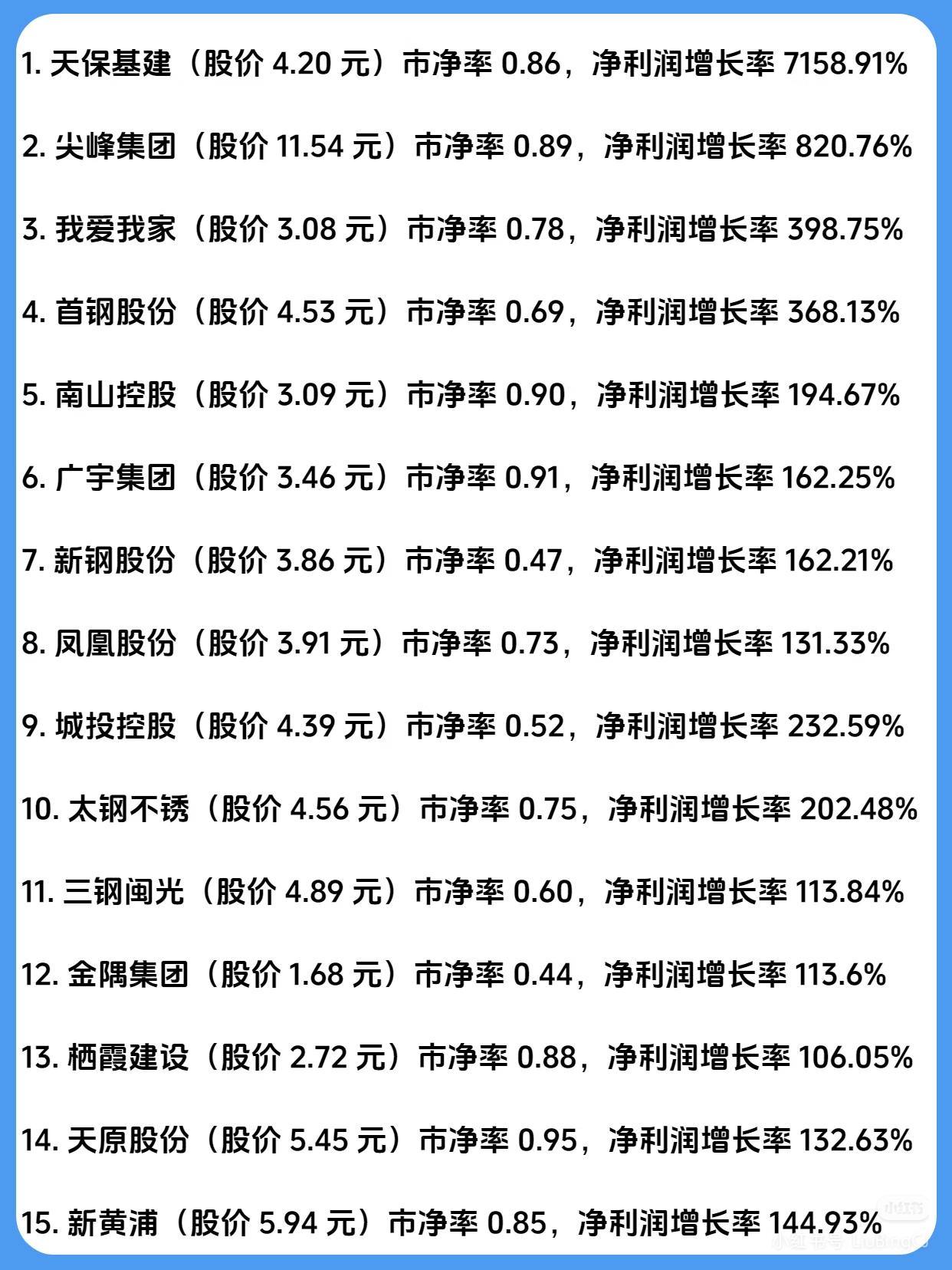 当"破净"遇上"猛增":A股50家低估值高成长股的掘金逻辑 近日一组市场数据引发关注——A股50家破净股竟集体交出"业绩猛增"的亮眼答卷(如图1所示)。所谓"破净股",即市净率(PB)低于1的股票,意味着市场对其资产价值的评估已跌破账面净资产;而"业绩猛增"则指向净利润增长率的大幅跃升。这种"低估值+高增长"的反差组合,恰似市场投下的"认知迷雾",也为理性投资者提供了挖掘价值洼地的独特视角。 一、数据透视:破净与增长的"矛盾统一" 从用户提供的四张图表看,这50家破净股的财务特征极具研究价值(图2-4): - 破净幅度显著:市净率最低的金隅集团仅0.44,新钢股份、河钢股份等也低至0.47,超半数个股PB在0.6-0.9之间,远低于市场平均PB(当前A股整体PB约1.5)。 - 增长动能强劲:净利润增长率普遍高企,天保基建以7158.91%的增速"断层领先"(图2),尖峰集团(820.76%)、我爱我家(398.75%)、首钢股份(368.13%)等亦实现3倍以上增长;即便排名靠后的九安医疗(16.11%),其增速仍跑赢多数行业均值。 - 行业分布多元:覆盖地产(天保基建、我爱我家)、钢铁(新钢股份、华菱钢铁)、基建(中国交建相关标的)、医药(吉林敖东)、科技(深天马A)等领域,既有传统周期行业的复苏,也有新兴产业的边际改善。 二、矛盾背后的投资逻辑:为何"破净"与"增长"能共存? 市场对破净股的固有印象多为"基本面恶化"或"行业衰退",但此次50家公司的集体"逆袭",揭示了三重底层逻辑: 1. 周期反转的力量:部分行业(如钢铁、地产)经历供给侧改革后,产能出清叠加需求回暖,企业盈利弹性释放。例如新钢股份(PB 0.47,净利增162.21%)作为区域龙头,受益于钢材价格上涨与成本控制,业绩超预期;天保基建(PB 0.86,净利增7158.91%)则因房地产项目结算集中,利润表大幅改善。 2. 市场情绪的错杀:部分优质公司因短期利空(如行业政策调整、市场风格切换)被错判。例如我爱我家(PB 0.78,净利增398.75%)作为房产中介龙头,虽受地产销售波动影响,但其数字化升级与门店优化推动效率提升,业绩逆势高增却被市场低估。 3. 资产质量的隐性价值:破净股往往隐含"安全垫"。若公司持续盈利且资产真实(如金隅集团PB 0.44,持有大量优质土地储备),一旦市场情绪修复,PB回归1的过程将带来显著估值修复空间。 三、掘金策略:如何在"破净+增长"中避雷寻机? 面对50家破净高增股,投资者需跳出"唯PB论",聚焦三大筛选维度: - 增长可持续性:优先选择增长源于主营业务改善(如销量/价格提升、成本下降)而非一次性收益(如资产出售)的公司。例如尖峰集团(净利增820.76%)的增长主要来自水泥主业量价齐升,更具持续性;而部分公司若依赖非经常性损益,需警惕"业绩变脸"风险。 - 资产真实性:重点核查资产负债表,排除"虚胖"资产(如商誉占比过高、存货/应收账款异常)。例如河钢股份(PB 0.47)作为钢铁龙头,资产以实物产能为主,真实性更可靠;而部分轻资产公司若PB过低,需警惕资产减值风险。 - 行业景气度:结合宏观趋势判断增长能否延续。例如新能源产业链的延伸标的(如深天马A,PB 0.83,净利增166.25%)受益于面板行业周期上行,增长更具确定性;而传统产能过剩行业(如部分化工股)需观察需求端是否真正回暖。 结语:"反差"即机会,理性穿透迷雾 50家破净股的"业绩猛增",本质是市场定价与企业价值的阶段性背离。对投资者而言,这既是检验"逆向思维"的试金石,也是挖掘"戴维斯双击"(低估值+高增长共振)的黄金窗口。但需牢记:破净不是买入理由,增长也非永恒承诺——唯有结合行业逻辑、财务质量与增长持续性,方能在"不可思议"的市场现象中,找到真正的"价值锚点"。