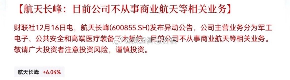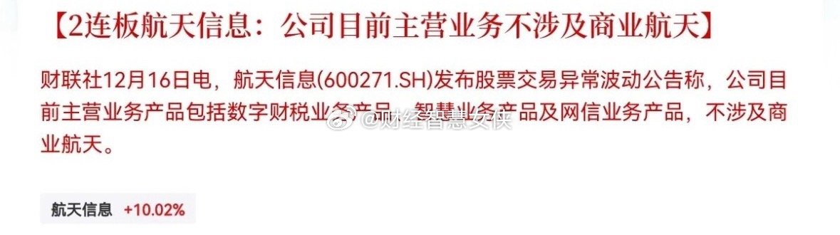突发消息!突发消息!航天信息、航天工程、航天长峰利空三连发!不出意外的话,明日这三家公司股价要大震荡了,持有这三家公司的股民们,明日恐怕要大面了!就在刚刚!看到三家商业航天概念公司航天信息、航天长峰、航天工程同步发布了股票交易异常波动公告称,公司主营业务不涉及商业航天,这个消息一出,股民们已经群情激奋了,绝大部分认为是利空消息,三家公司近期趁着商业航天概念股价都经历了大幅上涨,航天信息更是走出了两连板,而今晚三家公司都站出来澄清没有商业航天业务,这明显是想给市场情绪降温了,三家公司既然与“商业航天”无关,这直接否定了推动此前股价大涨的核心预期,不出意外的话,明日纯粹炒作该概念的资金很可能选择离场,引发公司股价大震荡!股民们!坐稳扶好!受此利空消息影响,预计明日三家公司要低开低走了,甚至有可能跌停!股票