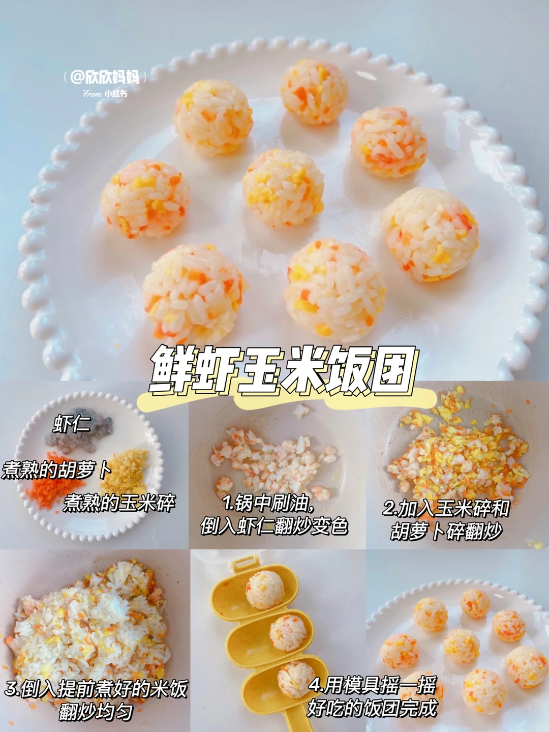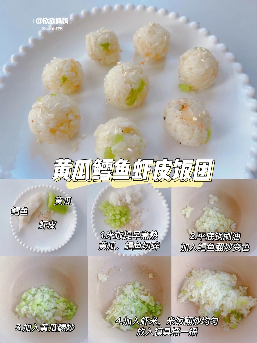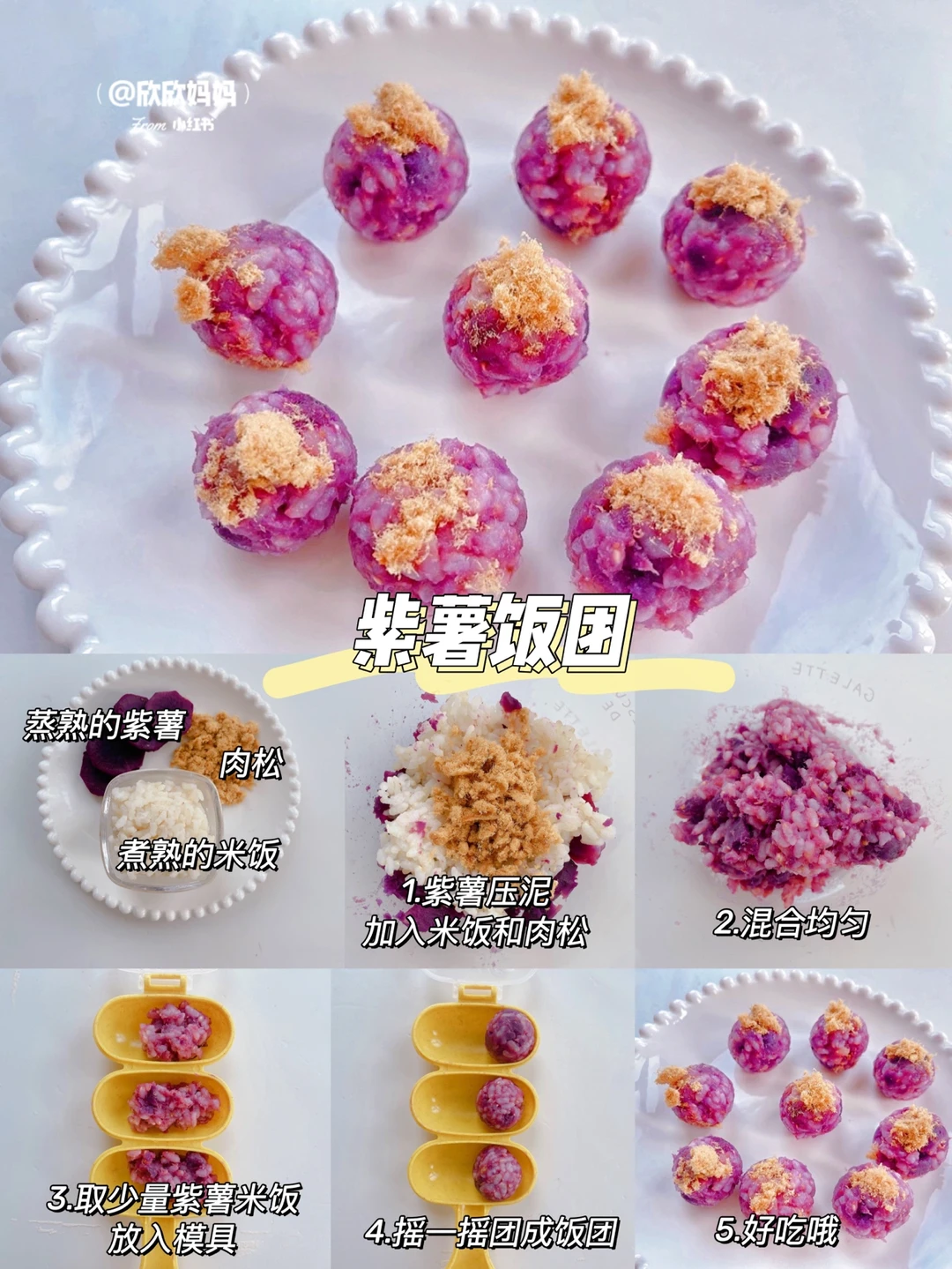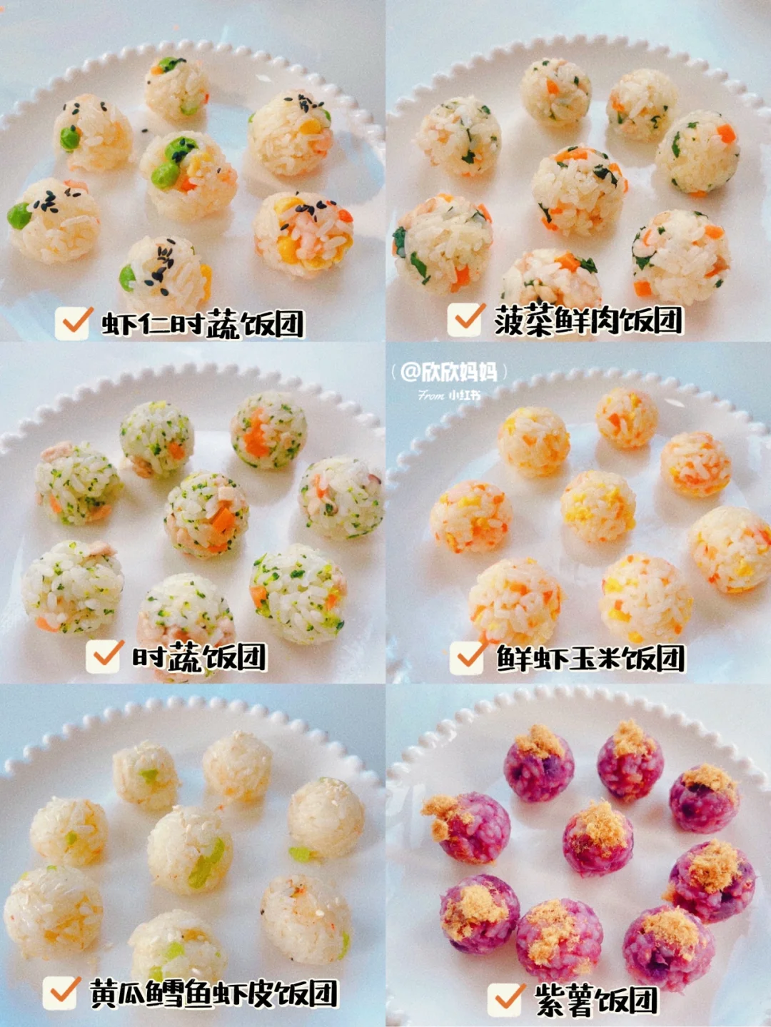 有没有不爱吃肉、不爱吃菜的宝宝?今天来分享6款营养下饭的小饭团,荤素搭配、方便快手、造型可爱很适合锻炼宝宝的自主进食能力! 〰️〰️ 🌈 详细做法👀图3~图8 1️⃣虾仁时蔬饭团 2️⃣紫薯饭团 3️⃣时蔬饭团 4️⃣菠菜鲜肉饭团 5️⃣鲜虾玉米饭团 6️⃣黄瓜鳕鱼虾皮饭团 〰️〰️ ⚠️食材大小根据自家的宝宝咀嚼情况来调整 ⚠️一岁以下宝宝不加盐酱油等调料,可以加天然调味料(香菇粉、海苔粉、虾皮粉)一岁以上宝宝可以适量加些调料 〰️〰️ 如何让饭团成型❓ ✔️煮米饭不要煮的太干,不然不易成团 ✔️配菜不用放太多 ✔️没有饭团模具也可以用保鲜膜捏成小球 ✅做法都在图片上哦,有疑问🤔️也可以评论区留言喔😄 . 💡关注我带您解锁更多辅食制作