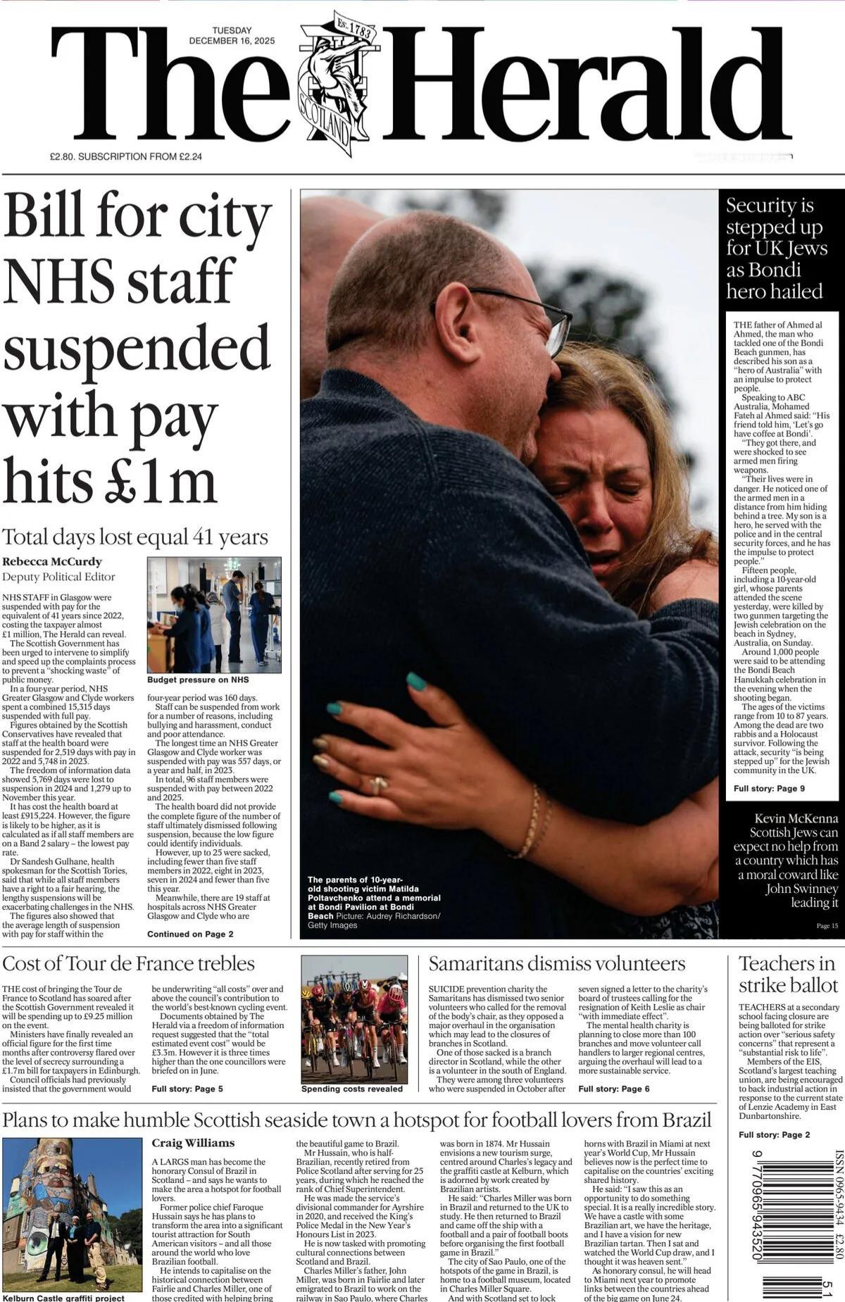 《苏格兰先驱报》头版报道,照片显示,在澳大利亚悉尼邦迪海滩惨案中10岁枪击案受害者玛蒂尔达·波尔塔夫琴科的父母在邦迪海滩的邦迪海滩参加一场纪念活动。 孩子殒命了,父母也是十分伤心难过,