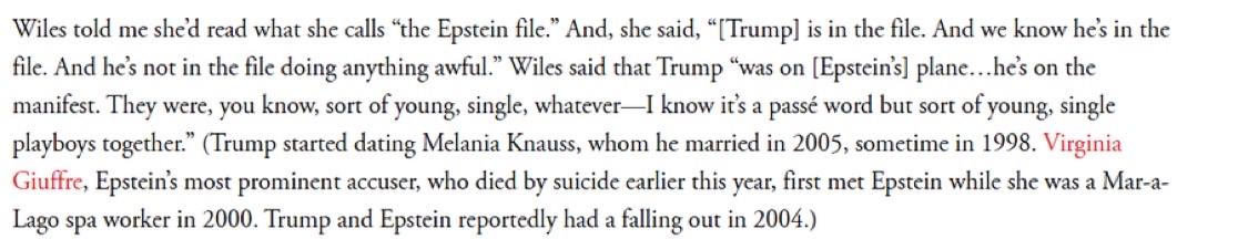 苏西·威尔斯表示,特朗普出现在爱泼斯坦的记录中,包括航班乘客名单,但她表示,他的出现并不能构成犯罪证据。 她将特朗普与杰弗里·爱泼斯坦的关系描述为社交关系,称两人都是“年轻的单身花花公子”,并坚称档案中没有任何证据表明特朗普从事非法或虐待行为。 来源:《名利场》