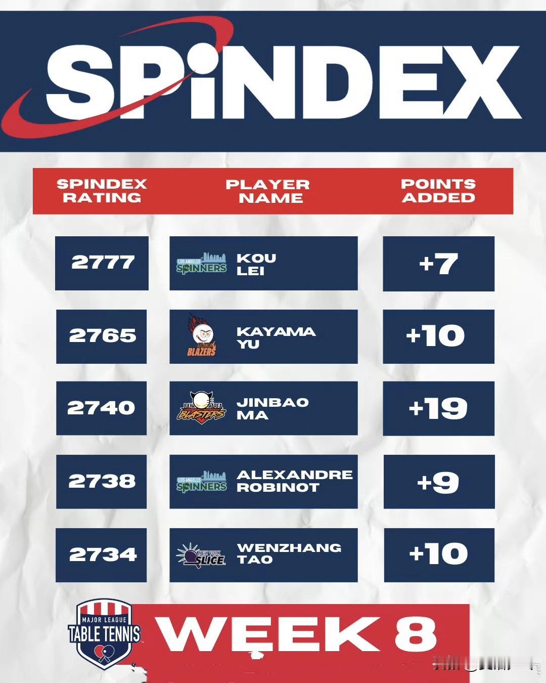在刚刚结束的 MLTT 洛杉矶场比赛中 选手们各显神通,为各自的队伍拿下分数 经历了三天的竞技对决 让我们看看选手们的个人积分 都发生了什么变化吧! 在 SPINDEX 球员水平评估积分体系中 湾区暴击队的 马金宝(Ma Jinbao)积分+19 纽约切片队的 陶文章(Tao Wenzhang)积分+10 亚特兰大烈焰队的 加山裕(Kayama Yu)积分+10 洛杉矶旋风队的 Alexandre Robinot 积分+9 洛杉矶旋风队的 寇磊(Kou Lei)积分+7 MLTT美国职业乒乓球联赛 2025.12.16