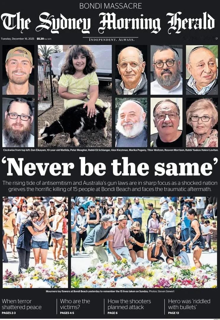 澳大利亚《悉尼先驱晨报》头版报道,该报用黑底背景,刊登在悉尼邦迪海滩惨案上逝去的部分受害者的照片,其中包括一名10岁的英国女童。 该报标题:“永不复返”。 反犹主义的浪潮不断高涨,澳大利亚的枪支法律成为人们高度关注的焦点。整个国家沉浸在悲痛之中,为邦迪海滩发生的造成15人死亡的恐怖袭击事件而哀伤,并直面这场悲剧带来的创伤后果。