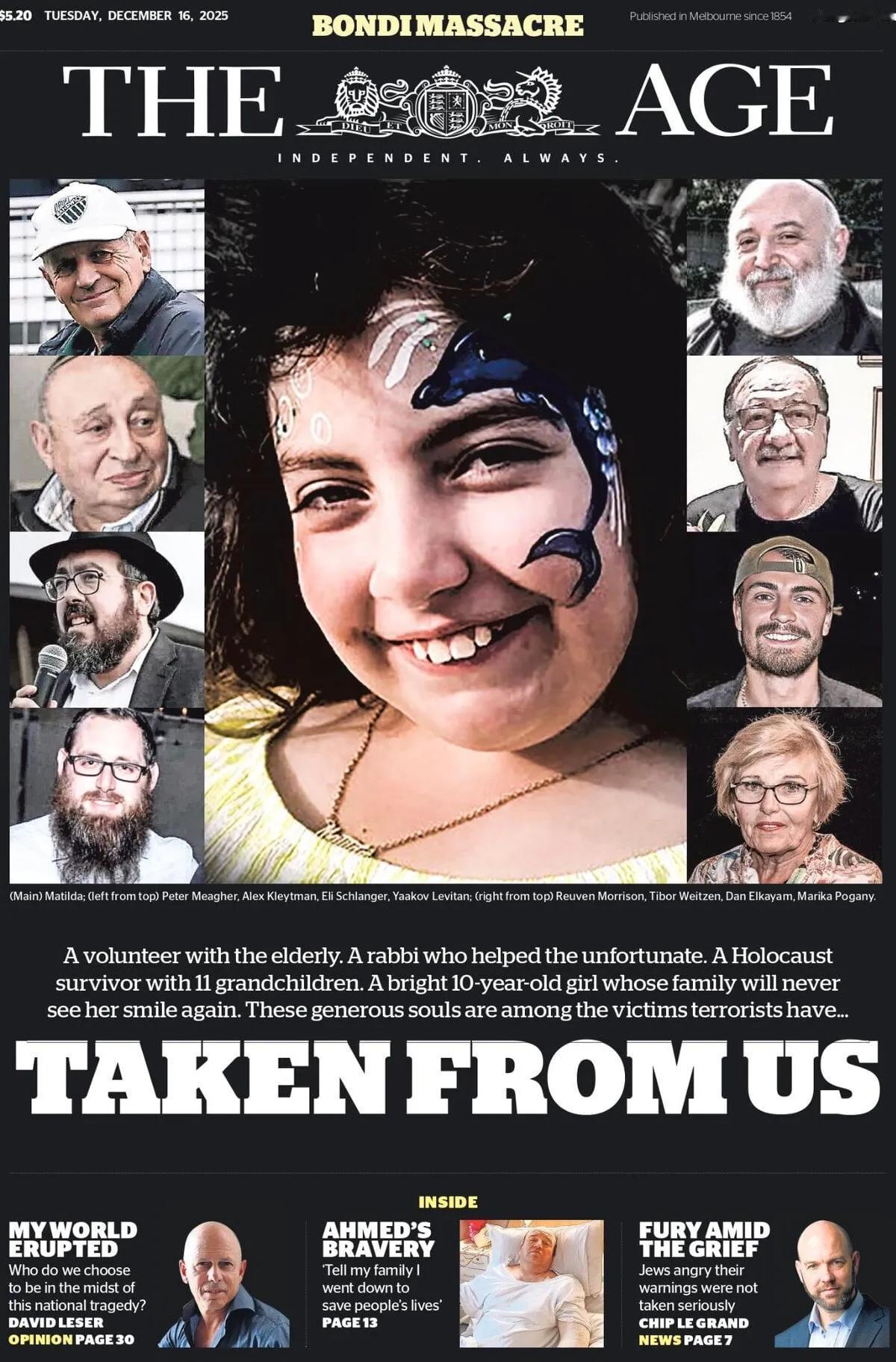 澳大利亚《时代报》头版报道,该报刊登在悉尼邦迪海滩惨案中部分殒命受害者的照片。 一位照顾老人的志愿者。 一位帮助不幸者的拉比。 一位有11个孙辈的大屠杀幸存者。 一个聪明的10岁女孩(中间大幅照片),她的家人再也看不到她的笑容了………