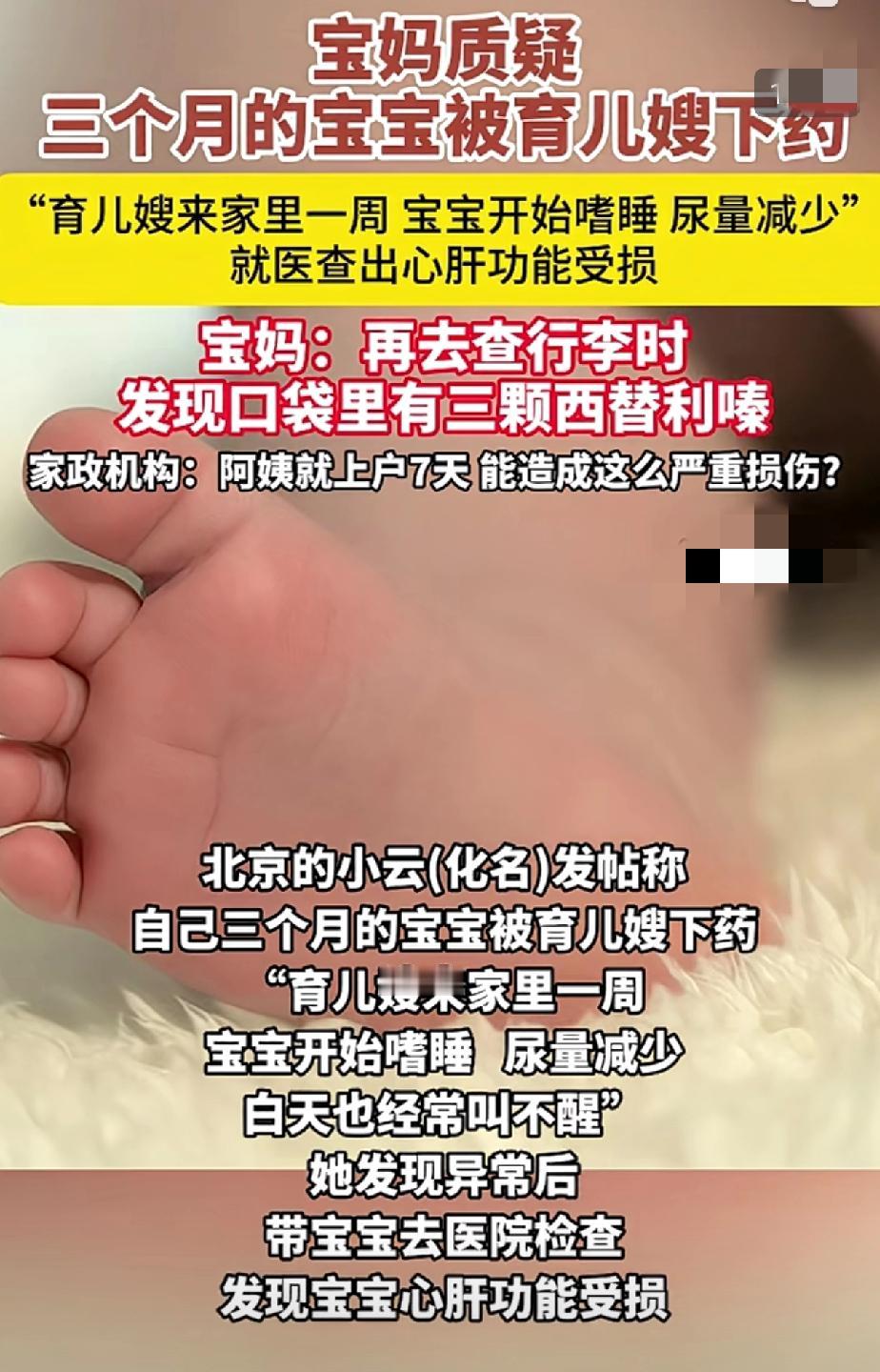 丧尽天良!北京宝妈崩溃曝光!育儿嫂带娃一周,三月大宝宝心肝功能受损 北京一位宝妈的遭遇让所有家长都揪心不已!花高价请的育儿嫂,才带娃一周,三个月大的宝宝就变得异常嗜睡,尿量锐减,甚至白天都叫不醒。宝妈赶紧带娃去医院,检查结果显示孩子心肝功能受损,这个消息像晴天霹雳一样击垮了全家。 更让人气愤的是,宝妈在育儿嫂口袋里发现了被剪成小粒的抗过敏药西替利嗪,而这药在育儿嫂入职时根本没有。面对质问,育儿嫂却坚称药是自己用的,否认给宝宝喂过。涉事家政公司还轻描淡写地说“才上户7天,不可能造成严重损伤”,这回应简直让人无语! 西替利嗪对婴幼儿来说,剂量和使用都有严格要求,误服或过量可能导致嗜睡甚至肝肾功能损伤,宝宝的症状和药物副作用完全吻合。这几年类似育儿嫂伤害宝宝的事发生过不少,真的让人不得不担心家政行业的监管问题。 提醒各位家长,找育儿嫂一定要选正规机构,做好背景调查,家里装监控也很有必要!你觉得育儿嫂的说法可信吗?家政公司该担责吗?评论区聊聊!