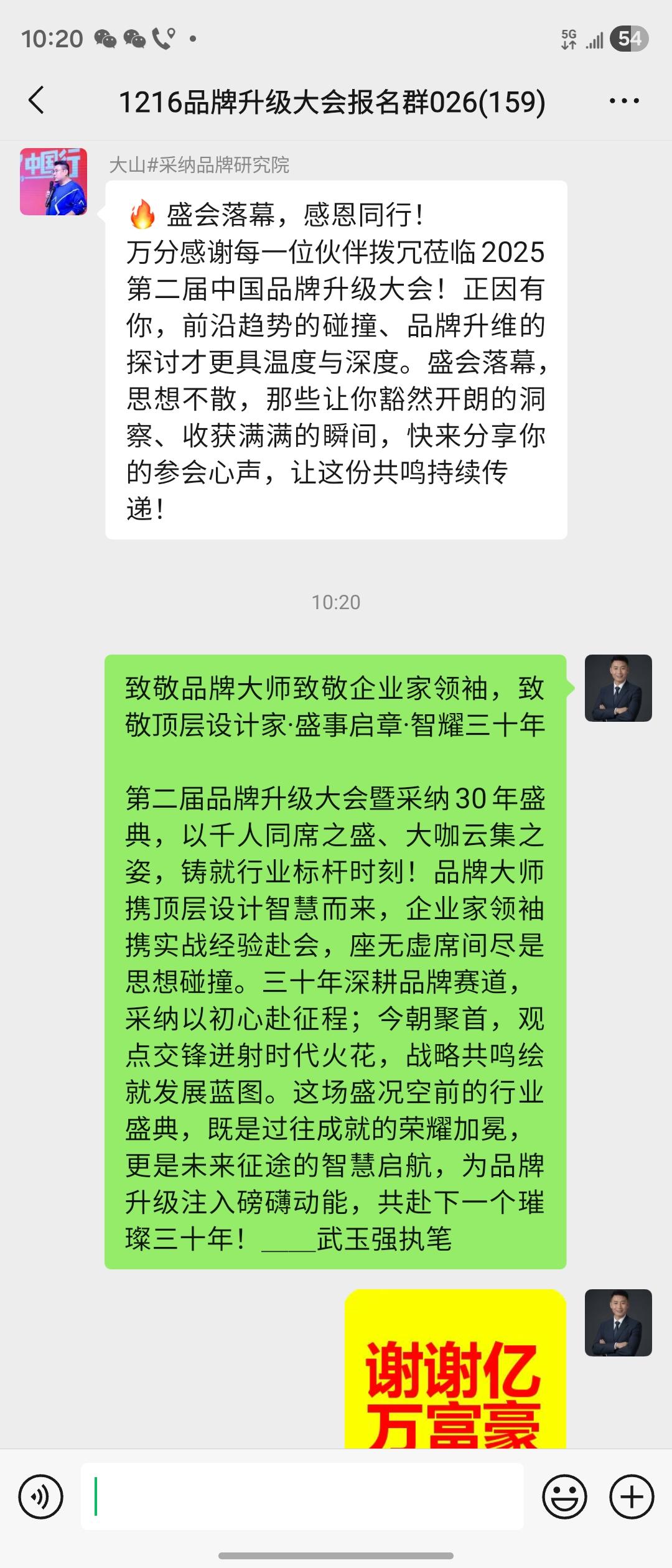 品牌大师中国行🔥 盛会落幕,感恩同行!品牌大师全球第一推手 万分感谢每一位伙伴拨冗莅临2025第二届中国品牌升级大会!正因有你,前沿趋势的碰撞、品牌升维的探讨才更具温度与深度。盛会落幕,思想不散,那些让你豁然开朗的洞察、收获满满的瞬间,快来分享你的参会心声,让这份共鸣持续传递! 大咖云集,智慧碰撞,火花飞扬,拥抱国运投资中国🇨🇳 致敬品牌大师致敬企业家领袖,致敬顶层设计家·盛事启章·智耀三十年 第二届品牌升级大会暨采纳30年盛典,以千人同席之盛、大咖云集之姿,铸就行业标杆时刻!品牌大师携顶层设计智慧而来,企业家领袖携实战经验赴会,座无虚席间尽是思想碰撞。三十年深耕品牌赛道,采纳以初心赴征程;今朝聚首,观点交锋迸射时代火花,战略共鸣绘就发展蓝图。这场盛况空前的行业盛典,既是过往成就的荣耀加冕,更是未来征途的智慧启航,为品牌升级注入磅礴动能,共赴下一个璀璨三十年!__武玉强执笔