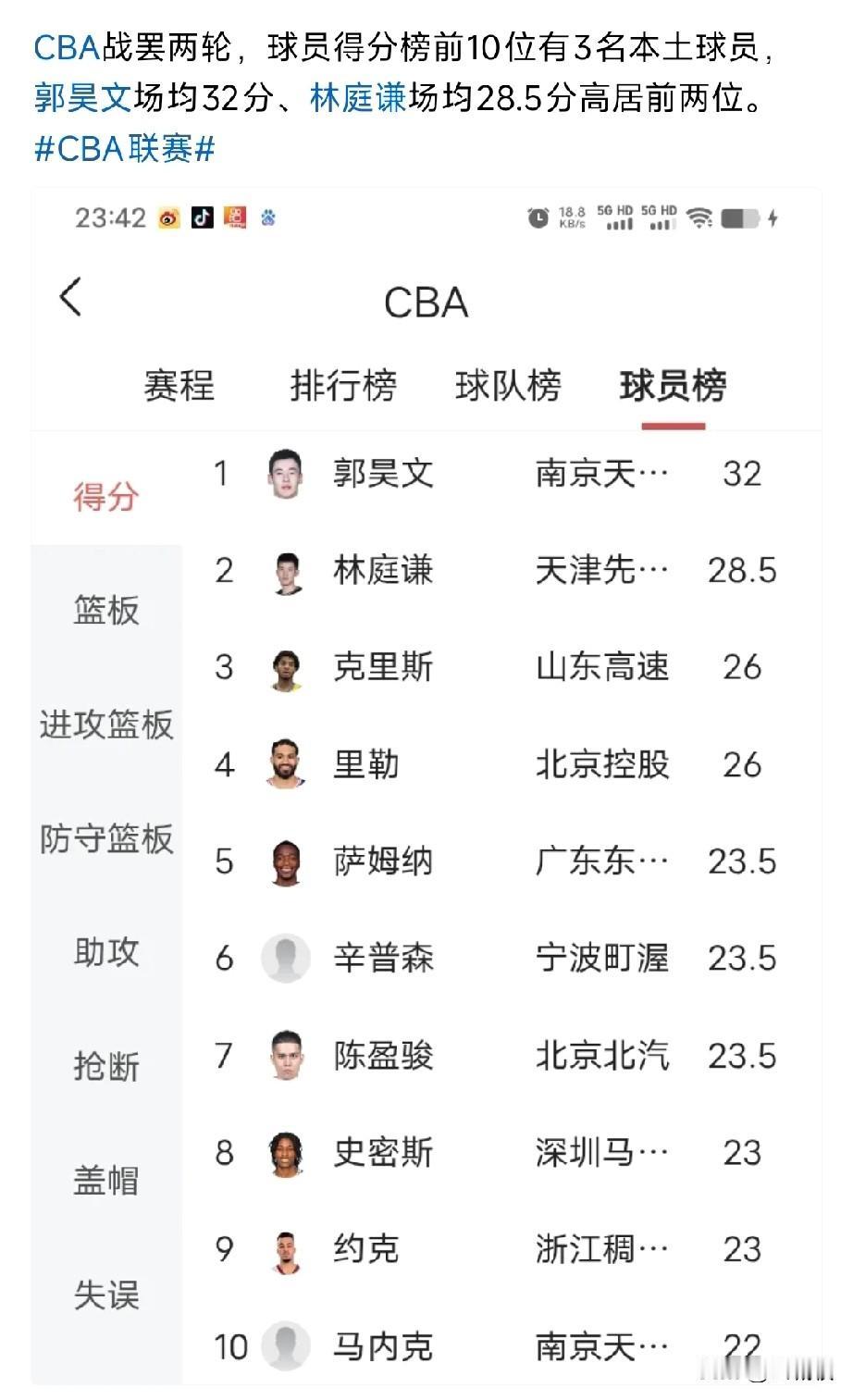 看了CBA前2轮的得分榜,真是一喜一忧,明年的世预赛我们出线形势更加堪忧啊! CBA前2轮战罢,国内有3名球员破天荒地上了得分榜前10位。南京同曦的郭昊文以场均32分的得分位列榜首。排在第2位和第7位的两位球员就是来自宝岛的林庭谦和陈盈骏。其他7位都是各个俱乐部的外援。 喜的是国内球员终于也终于在外援主导进攻的CBA联赛中有了自己的一席之地,郭昊文就是证明。忧的是第2位的林庭谦和第7位的陈盈骏都来自宝岛,明年3月份的世预赛将和我们直接碰面,争夺出线席位。按照我们男篮两度惨负韩国男篮的这种状态,明年面对中国台北我们能不能拿下还是未知数,只可惜像郭昊文这样的球员入选国家队的机会几乎渺茫,真为郭士强主教练担心着急啊!