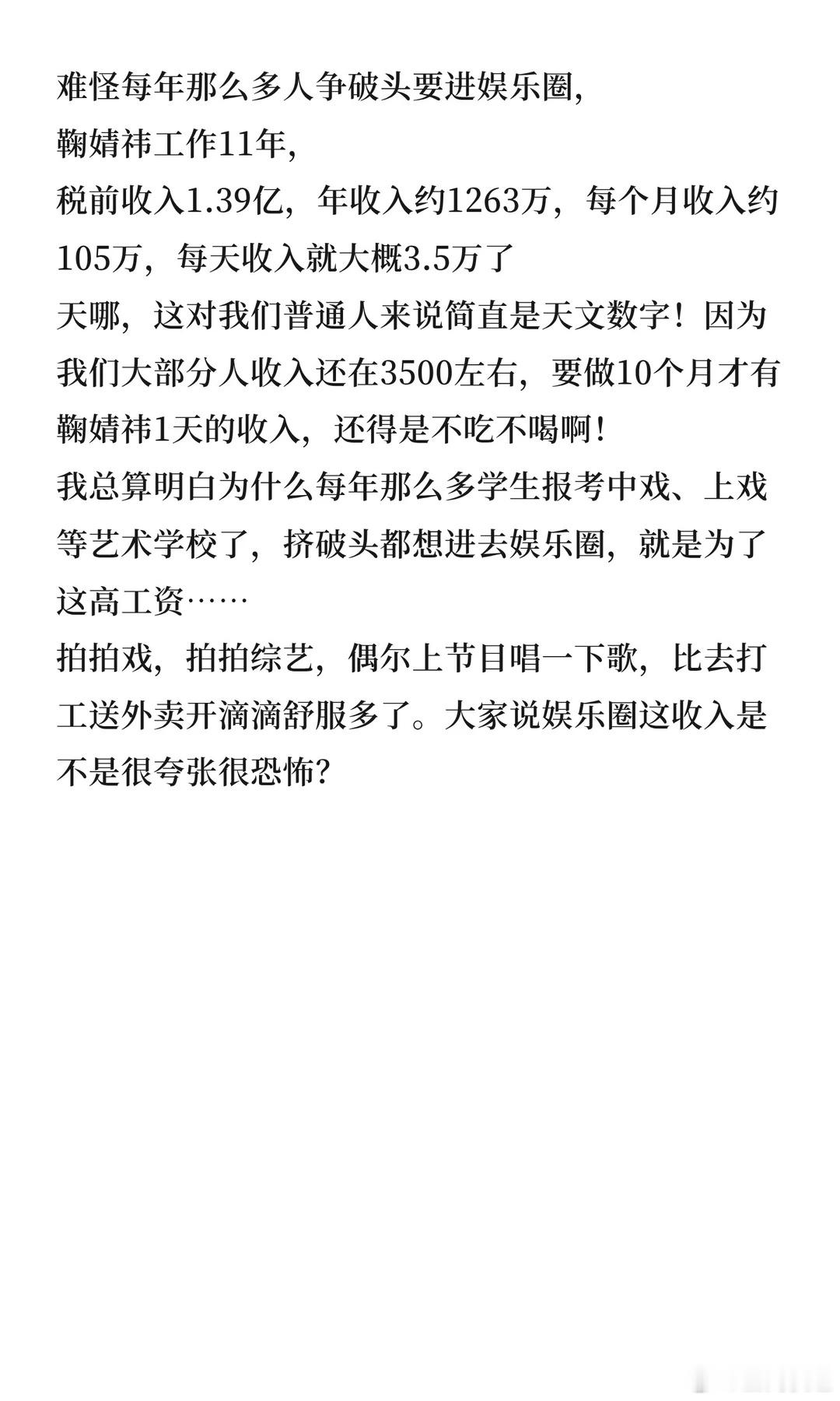 难怪每年那么多人争破头要进娱乐圈有网友说鞠婧祎每月25万元固定工资,难怪每年那么多人争破头要进娱乐圈。鞠婧祎工作11年,税前收入1.39亿,年收入约1263万,每个月收入约105万,每天收入就大概3.5万了!这对我们普通人来说简直是天文数字!因为我们大部分人收入还在3500左右,要做10个月才有鞠婧祎1天的收入,还得是不吃不喝啊!其实这是一种误导性言论,任何行业你做到顶尖收入都很高!直播带货的网红顶尖一年收入都几十个亿的咋没人说?娱乐圈竞争异常激烈,又有几个人能到顶级?每年北影中戏上戏一堆堆毕业生又有几个熬出头了?顶级明星收入确实多,但是公司赚的更多吧😨现在律师不是在说公司隐瞒收入拖欠工资伪造签名合约期满不放人吗🥲公司曝光明星收入是什么意思?这是要利用我们网友帮忙转移视线吗???鞠婧祎每月25万元固定工资鞠婧祎已起诉丝芭传媒 难怪每年那么多人争破头要进娱乐圈