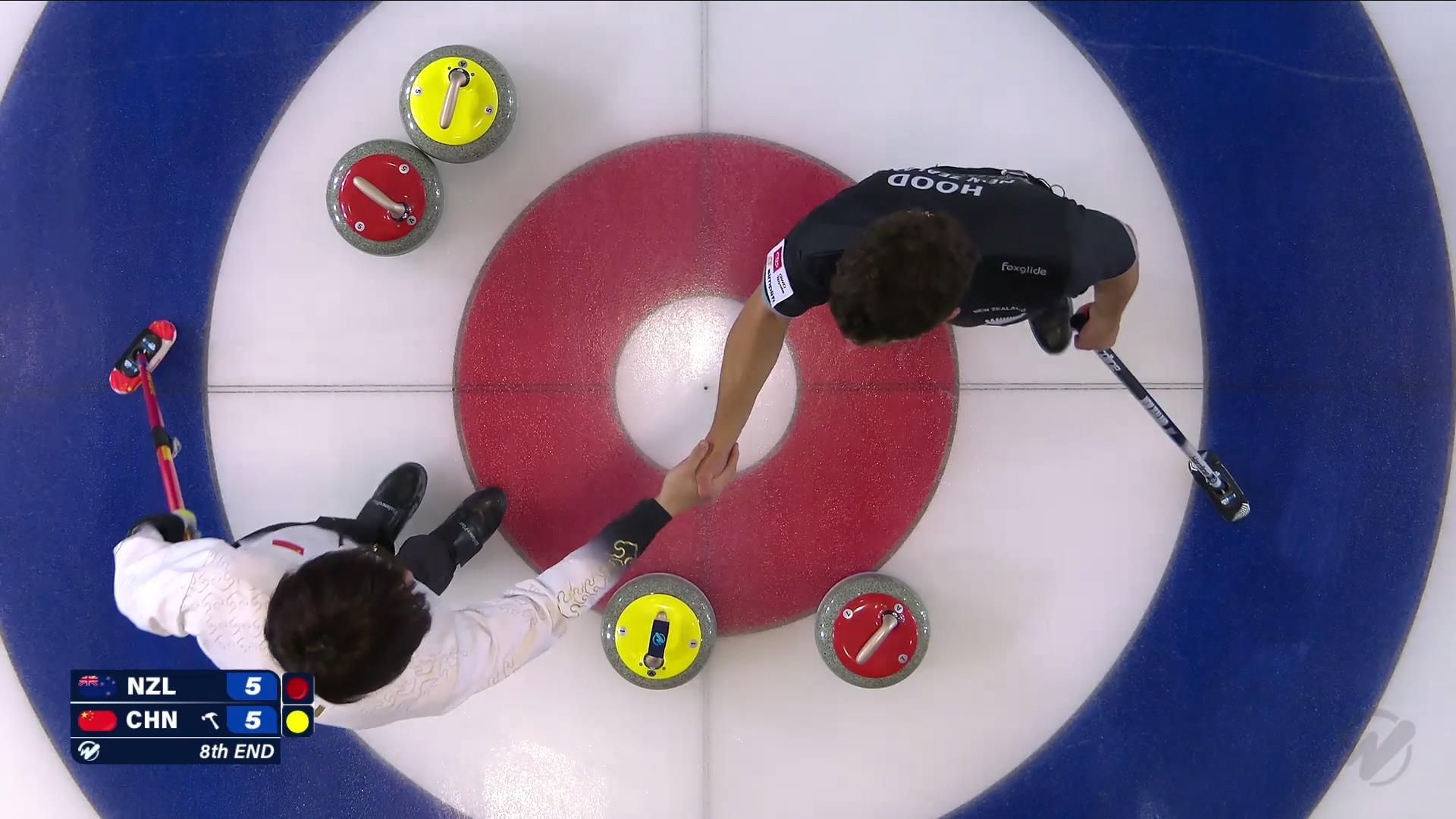 【很有感觉的一个截图】中国队本次奥运资格赛除了打荷兰,目前其它其它场次全都提前握手,第一场对匈牙利是比分领先太多,提前两局握手;第二场打法国,法国就算打第八局壶也不够用,提前一局握手;第四场对丹麦,因为对手大本营有效壶不足,提前一壶握手;今天打新西兰,在中国队最后一投前已经确保胜利,比赛自动结束。