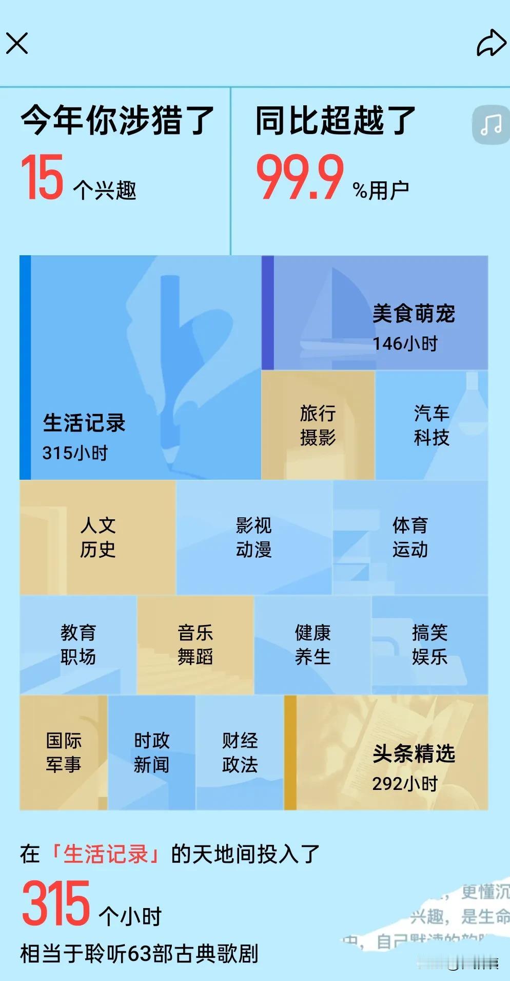 头条2025年度总结 涉猎了15个兴趣,超99.9%的用户,看来我的兴趣爱好真广泛[呲牙][捂脸] 在生活记录中投入了315个小时[笑哭][笑哭] 时间都去哪儿啦?[害羞][害羞][黑线][黑线]