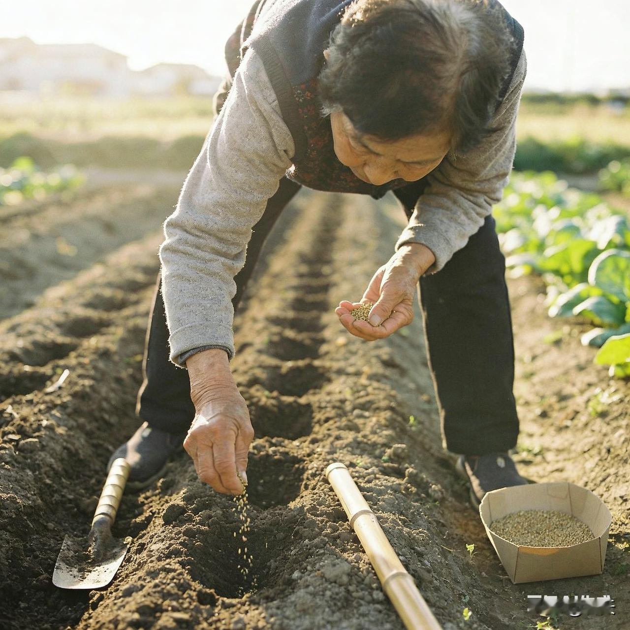 大龄种菜记 晨光里,老人弓着背翻松菜地,粗糙的手捏起菜籽,均匀撒向新整的畦田。覆上薄土、浇透清水,每一步都透着认真。小菜园藏着热爱,播种的是希望,也是晚年的惬意时光。 图片描述(适配1:1比例): 近景聚焦老人布满老茧的手撒菜籽,背景是整理平整的菜畦,竹制小铲子、装满种子的纸盆搁在田埂,晨光柔和洒下,画面满是田园温情与生活质感。