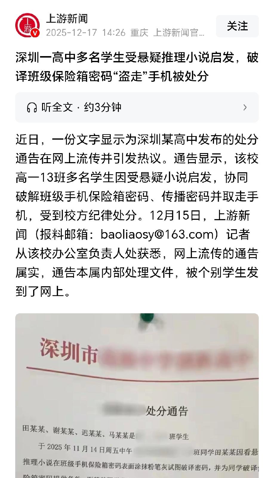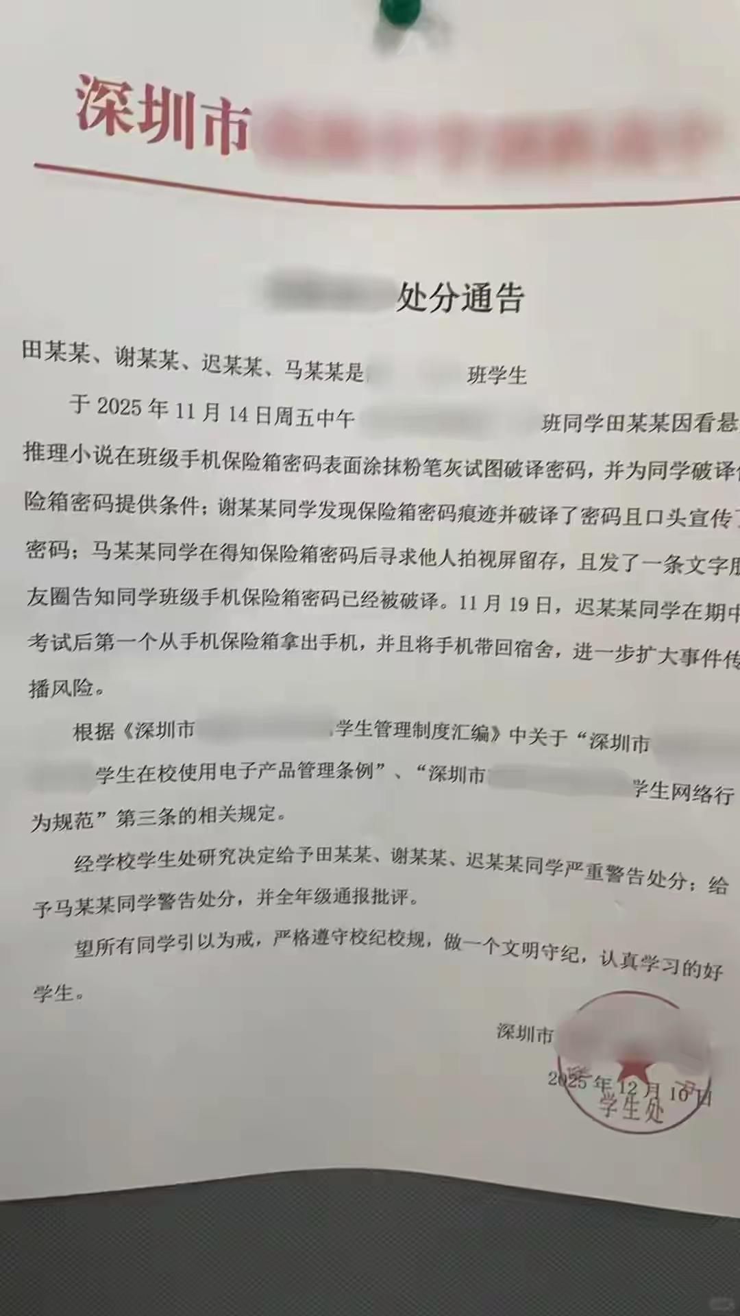 “柯南来了都要服!”广东深圳,某寄宿制学校为了方便学生和家长,把学生手机统一放在班级保险箱里。班里4名学生平时爱看悬疑推理小说,受小说的启发,他们一起协作破解了保险箱密码,并偷偷取出手机,还大肆给同学们宣扬保险箱密码。老师得知后,4名学生被学校依法处分。 田某某和谢某某是一所寄宿制高中的学生,最近因为迷上了悬疑推理小说,竟然把这一想法带进了现实。 他们学校有规定,学生返校后要把手机统一锁进班级保险箱,周五放学才能取回,密码只有班主任知道。 这本是为了方便寄宿生和家长联系,也能管住大家上课玩手机的心思。 可这一行为反而给了田某某和谢某某尝试的机会,两人把小说剧情瞄向了班级的保险箱。 田某某是悬疑推理小说狂热爱好者,脑子里总琢磨着小说里那些破案的小技巧。 看着班里的那个密码保险箱,他心里突然冒出来一个念头:这密码盘天天被班主任摸,肯定会留下指纹痕迹吧? 越想越兴奋,田某某悄悄找来了粉笔灰,小心翼翼地往密码盘上抹了一层。看着薄薄的粉笔灰覆盖住金属盘面,他既紧张又期待,仿佛自己就是正在破解密室的侦探。 没一会儿,同班的谢某某路过保险箱,一眼就瞥见了上面的粉笔灰和隐约的指纹痕迹。 谢某某平时也爱跟着田某某一起聊推理小说,这下可算逮着机会大展身手了。 他凑过去,眯着眼睛仔细辨认那些痕迹的走向,手指在密码盘上轻轻比划着,心里盘算:班主任按密码的时候,肯定是常用的数字,痕迹重的地方应该就是关键! 果不其然,谢某某没费多大劲,还真把密码给破译出来了。 破译密码的成就感冲昏了他的头脑,他高兴的不得了,转头就把密码跟班里的同学说了,那股得意劲儿,就差没把“我厉害吧”四个字写在脸上。 这事儿传到了马某某耳朵里,他可比谢某某会“搞事情”。 马某某不仅喊来同学,对着保险箱拍了一段视频留作纪念,还兴冲冲地发了条朋友圈,大咧咧地炫耀破译了手机保险箱密码。 发完朋友圈,他刷着评论区里同学的惊叹,心里别提多有面儿了,完全没意识到,自己这一举动已经把事情推向了更糟的地步。 期中考试一结束,迟某某就坐不住了。 他看着大家都在讨论那个密码,心里痒痒的,第一个抱着“试试看”的想法,用破译出来的密码打开了保险箱,把自己的手机取了出来,还偷偷带回了宿舍。 可他没料到,这一实质性的举动,直接扩大了事件的传播风险,也彻底把这起“恶作剧”捅到了老师面前。 东窗事发后,学校很快就查清了来龙去脉。依据《学生管理制度》里的行为规范,对田某某、谢某某、迟某某三人给予严重警告处分,对马某某给予警告处分,还在全年级进行了通报批评。 事后,学校不仅重置了所有保险箱的密码,还把保险箱都挪到了教师办公室保管。 四个小“侦探”这下彻底蔫了,原本想模仿小说里的情节过把瘾,没想到最后闯了祸,还背上了处分。 从法律角度而言,学校的处分合情合理。 《中小学教育惩戒规则》第八条规定,学生违反校规校纪,情节较重或者经当场教育惩戒拒不改正的,学校可予以训导、安排校规校纪教育等措施;情节严重的,可给予警告、严重警告等纪律处分。 本案中,学校明确规定“手机统一存入班级保险箱,密码由班主任掌管”,该制度旨在维护教学秩序、规范学生电子产品使用,符合校园管理的合理需求。 4名学生的行为已构成多重违规:田某某涂抹粉笔灰试探密码、谢某某破译密码并传播,属于故意违反校园管理制度。 马某某拍摄视频并在朋友圈公开密码,扩大了违规影响,迟某某擅自取出手机带回宿舍,直接破坏了学校的手机管理秩序。 学校依据《学生管理制度》,结合4名学生在事件中的不同过错程度,分别给予警告、严重警告处分并全年级通报,完全符合《中小学教育惩戒规则(试行)》的要求。 《民法典》第一千零三十二条规定,自然人享有隐私权,任何组织或者个人不得以刺探、侵扰、泄露、公开等方式侵害他人的隐私权,隐私包括不愿为他人知晓的私密信息。 班级保险箱的密码由班主任掌管,属于学校管理中的私密信息,且关联全体学生手机的存放安全,并非可公开的信息。 谢某某破译密码后擅自传播、马某某在朋友圈公开密码的行为,已构成对学校管理私密信息的泄露,同时可能导致其他学生效仿违规,扰乱校园公共管理秩序。 从隐私权延伸来看,虽然保险箱内手机归学生个人所有,但学生已同意遵守学校“统一存放”的规定,意味着自愿让渡了在校期间对手机的随时使用权。 而4名学生通过破解密码取走手机的行为,实质上侵犯了学校基于管理职责形成的合法管控秩序,也间接影响了其他同学手机的存放安全。 此外,其行为若未及时制止,还可能引发更多违规取物、信息泄露等连锁问题,后果不堪设想。