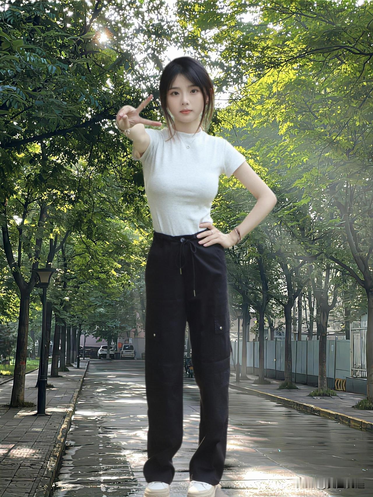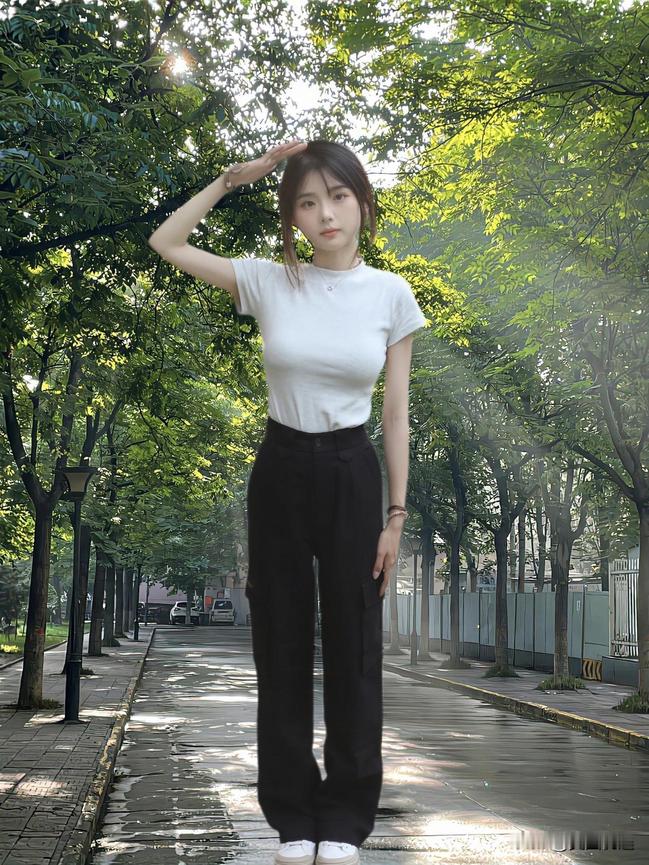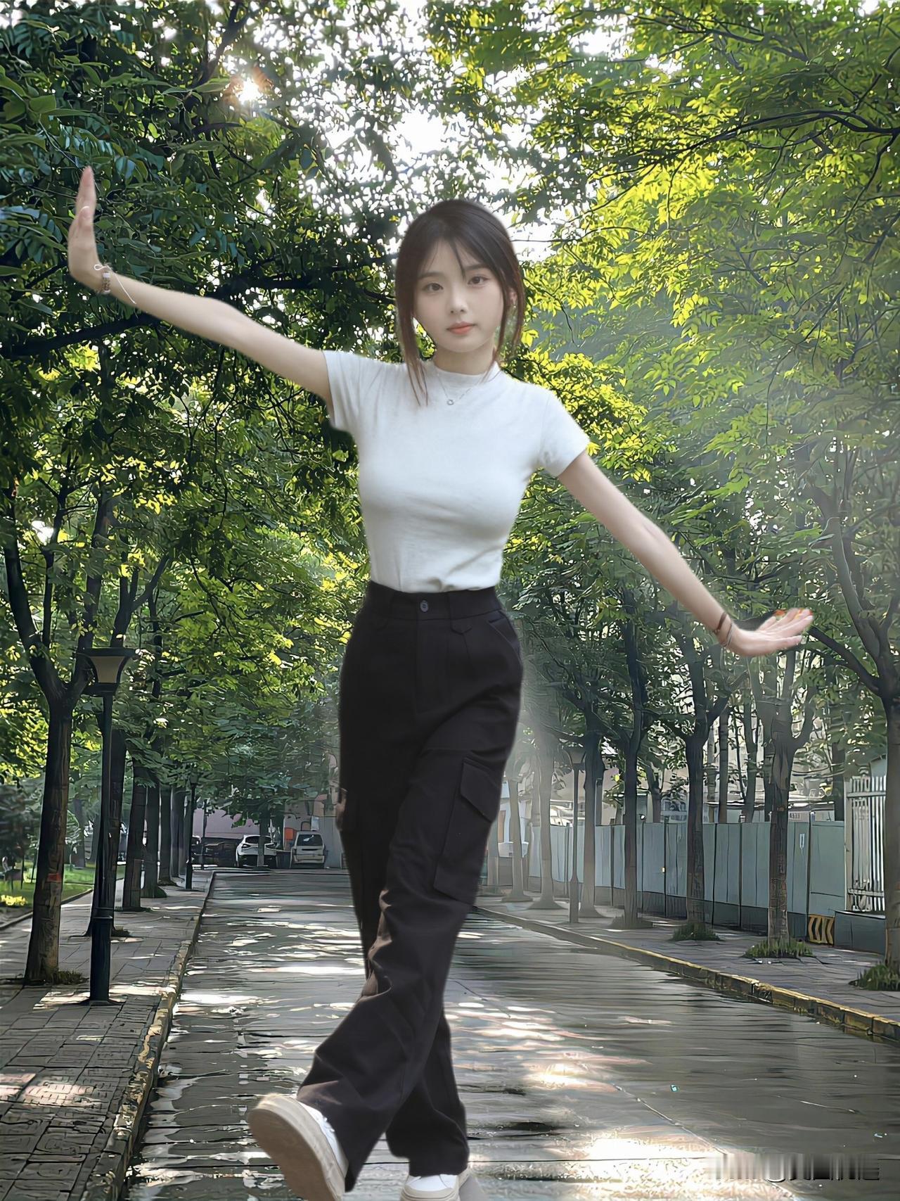 清新校园风,白T恤+黑裤子,阳光下的青春少女