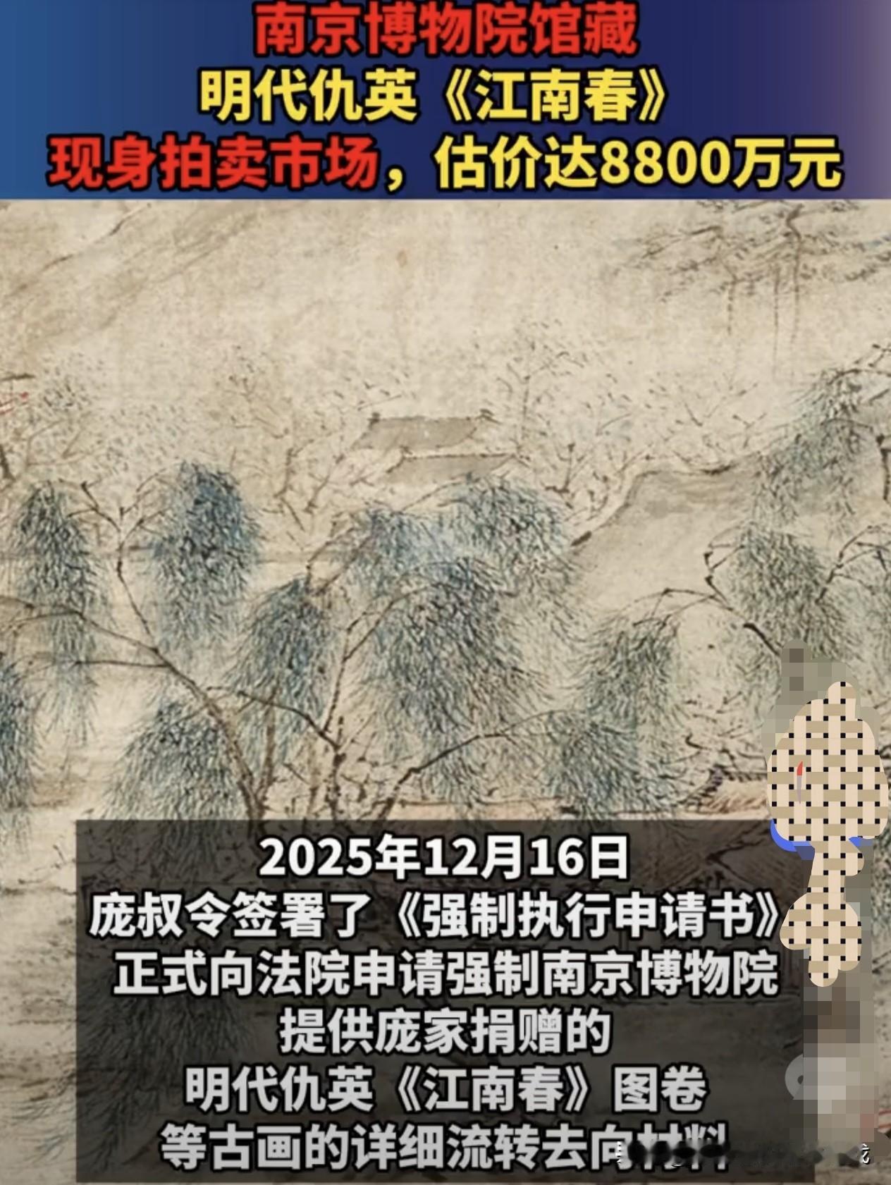 8800万,买断了三代人的信任。 庞家后人曾无偿捐赠137件传家宝给南京博物院,盼的是文脉留存,信的是国家机构。没想到仇英《江南春》竟现身拍卖行,估价数千万。 更让人寒心的是,此事既未告知捐赠方,也无明确合规手续,一句“划拨调剂”难以服众。 公立机构本该珍视民间捐赠、守护文化珍宝,可如今《江南春》的处置争议,严重违背捐赠初衷,也让大众对文物管理产生质疑。 捐赠是源于对文化事业的支持与信任,若如此随意处置捐赠品,以后谁还敢放心捐出珍藏?这对文化传承和公益事业的伤害不言而喻。 相关方必须给庞家后人、给公众一个合理的解释,否则公信力将荡然无存。 文物管理与处置,理应有严格规范和透明流程。希望相关部门重视此次暴露的问题,完善制度,为民间捐赠筑牢保障。
