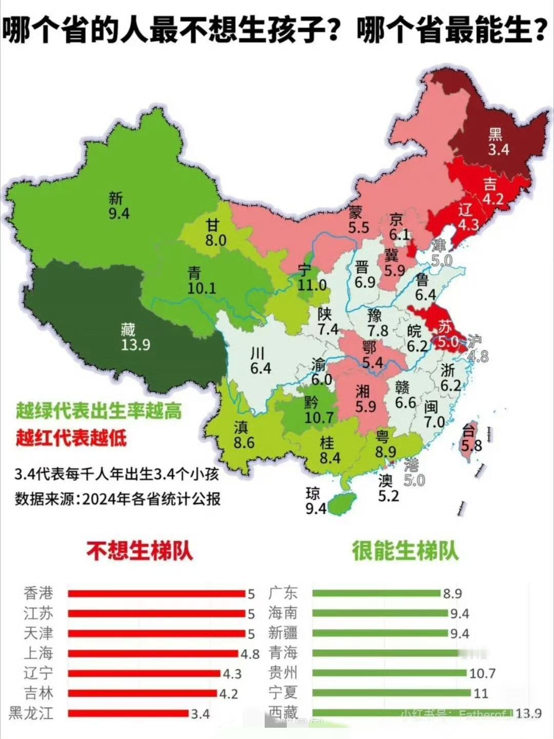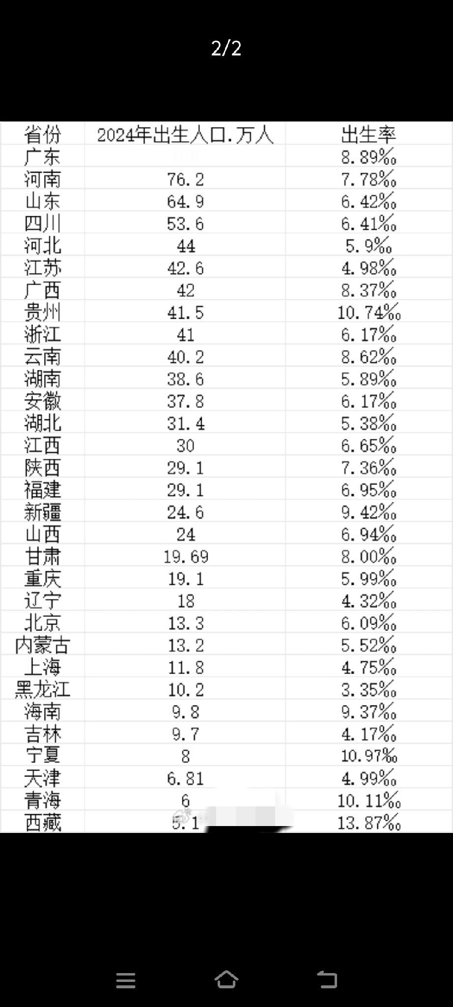 2024年出生人口排行出炉!广东出生人口全国排名第一,看看你的家乡排第几? 最近,2024年各省出生人口数据新鲜出炉,咱们先看一个超级亮眼的数据,那便是广东,一年出生了113万人,直接碾压其他省份,比第二名河南(76.2万)多了近37万!这是什么概念?相当于多生了一个中等城市的规模! 河南稳坐第二,76.2万的出生人口,不愧是人口大省;山东紧随其后排名第三,64.9万,这三个省份一直是出生人口的“第一梯队”。不过,咱们再看出生率,画风突变!西藏以13.87%的出生率高居榜首,宁夏10.97%、青海10.11%,这些西北省份生娃的积极性简直爆棚!反观东北和一些东部省份,出生率就有点低迷了,其中黑龙江3.35%、辽宁4.32%,吉林4.17%,上海4.75%,江苏4.98%。这些地方的年轻人好像更佛系,出生率不到5%。 有网友调侃:“广东人不仅会赚钱,还会生娃!”也有网友分析,广东外来人口多,年轻人扎堆,生育基数大;加上粤式“多子多福”观念,想不生都难! 而东北、上海、江苏这些地方,年轻人外流,老龄化严重,生娃动力自然不足。再加上房价、教育、医疗“三座大山”压着,很多90后连婚都不想结,更别说生二胎了。 还有人说,西北地区生活节奏慢、养娃成本低,亲戚朋友多,生娃就像“凑个热闹”,压力比一线城市小十倍!生活压力小,生娃更从容。 你的家乡出生率高吗排名第几?你身边有多少人生二胎、三胎?评论区聊聊。中国出生人口率 出生人口新趋势 新出生人口下降 出生人口数据 人口排名 出生人数 人口出生比例 人口断崖式下降,未来怎么办? 人口 出生人口