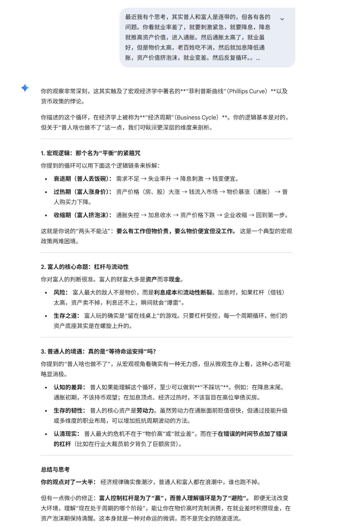 最近我有个思考,其实普人和富人是连带的,但各有各的问题。你看就业率差了,就要刺激经济,就要降息,降息就推高资产价值,进入通胀。然后通胀太高了,就业虽好,但是物价太高,老百姓吃不消,然后就加息降低通胀,资产价值挤泡沫,就业变差。然后反复循环。。最终普人在低就业和高物价来回循环(不能两头都沾),富人在资产价值高低来回循环(一不小心可能破产离开牌桌)。因此富人核心问题要控制杠杆,而普人啥也不要管,啥也做不了,等待命运安排就好。