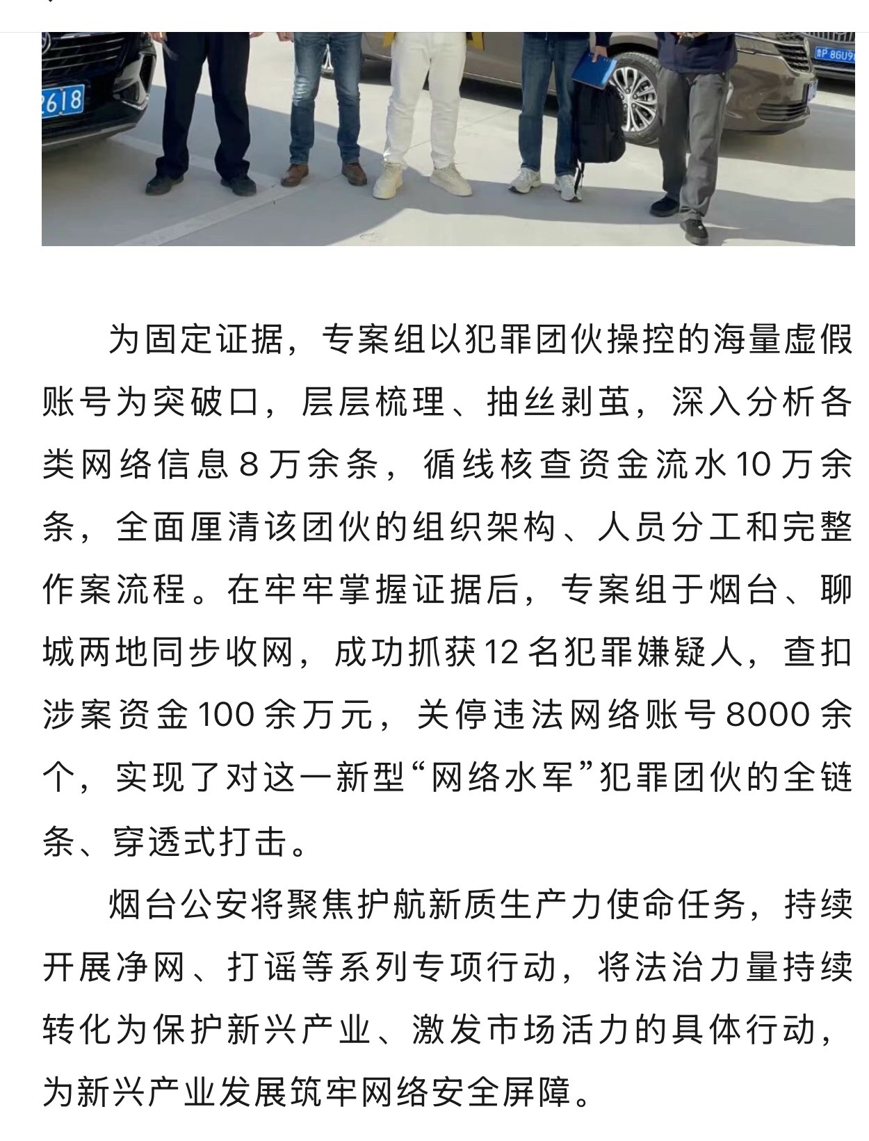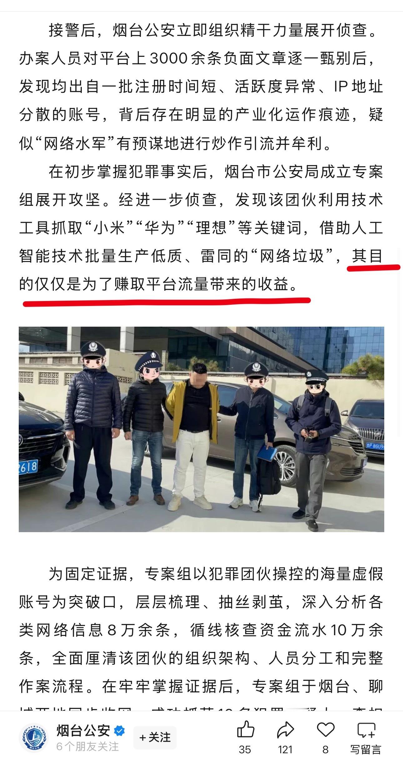大无语!烟台公安打掉一个炒作新能源汽车负面的团伙,关停8000多个账号。长期摸黑造谣小米、华为、理想,原因仅仅是因这三家流量大,能够赚取平台流量分成…这特么的,哪说理去,无语至极!