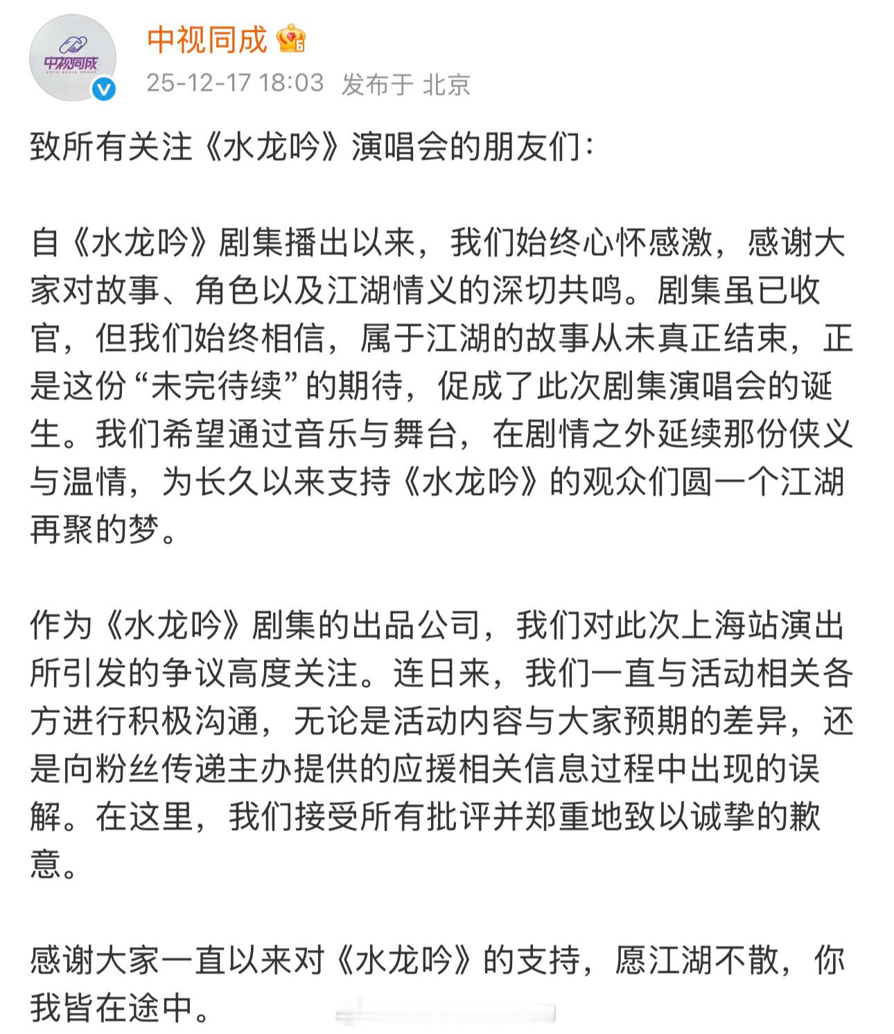 中视同成道歉声明水龙吟演唱会也知道办的不好啊