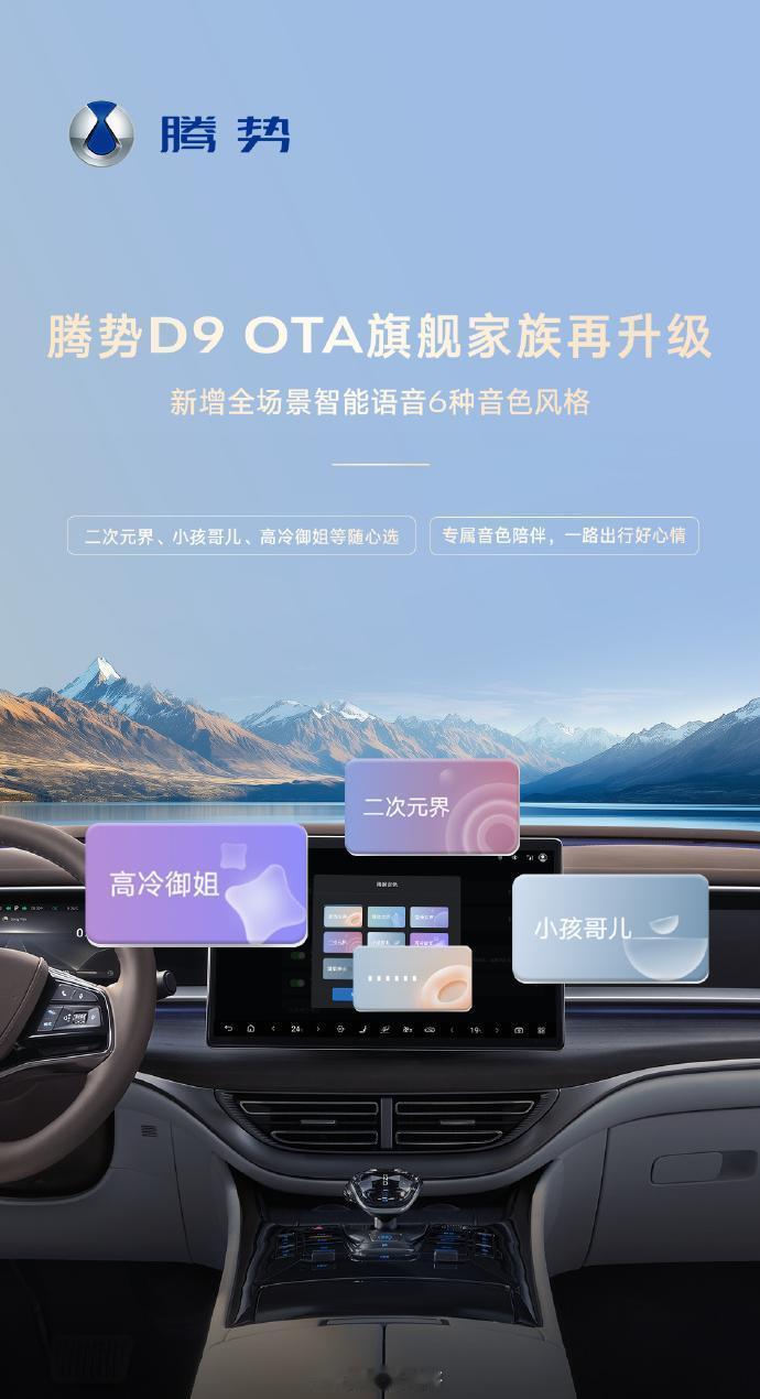 腾势D9 最新OTA升级,新增全场景智能语音6种音色风格根据个性选择喜欢的音色,可甜可盐可酷。这一次的升级适用于 2022/2023/2024款腾势D9及腾势D9四座版车型。腾势d9