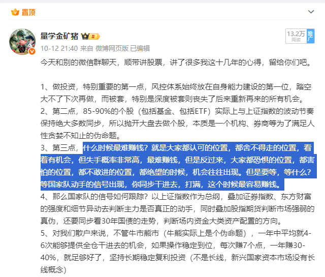 如果明天证券指数和东方财富足够强,能够带动指数再出一个中阳线,则有力度支持市场震荡上涨满足≥20个交易日的一个标准波段。1、11月21日的这个阴线打穿了左侧的箱体,后面用了6个交易日才站稳了这个大阴的实顶。2、昨天的阴线打穿了11月21日的阴线真底,形成一个新的极阴,但是今天只用了一个阳线就站稳了昨日的阴顶。对比一看,量性陡然增强!但因为证券相比上证整体慢了半拍(不过期指比上证要强,这是好的一面),所以明天期待证券和东方财富能够在中金公司重组成功利好的带动下走出一个漂亮的中大阳,带动上证指数突破60日均线,则市场很有希望能走出超过左侧震荡上涨11个交易日的波段,因为潜在的量性陡然增强,一旦明天二次确认,则理论上支持走一个震荡上涨满足≥20个交易日的标准波段。3、晚上讲这个是因为后市一旦如愿,你也要知道不要因为连续上涨就连续看多,市场整体,特别是证券指数包括东方财富的3日周期没有形成均线趋势多头的时候,你也不要从悲观再次极度乐观,要学会统计和跟踪上涨和下跌的时间天数,时间周期可以帮我们量化一个波段节奏的前期、中期、后期、尾巴,赚钱的机会多在前期和中期,一旦到了后期和尾巴,看着很赚钱,实际上轮动很快,下手节奏把握错了,一个波段容易不赚钱,这就是我的置顶微博里面有一段话:什么时候最难赚钱?就是大家都认可的位置,都舍不得走的位置,看着有机会,但失手概率非常高,最难赚钱,但是反过来,大家都恐惧的位置,都害怕的位置,都不敢进的位置,都绝望的时候,机会往往出现。但是要等,等什么?等国家队动手的信号出现,你同步干进去,打满,这个时候最容易赚钱。以上全文可以复制到腾讯元宝+deepseek去看看我是不是胡说八道!