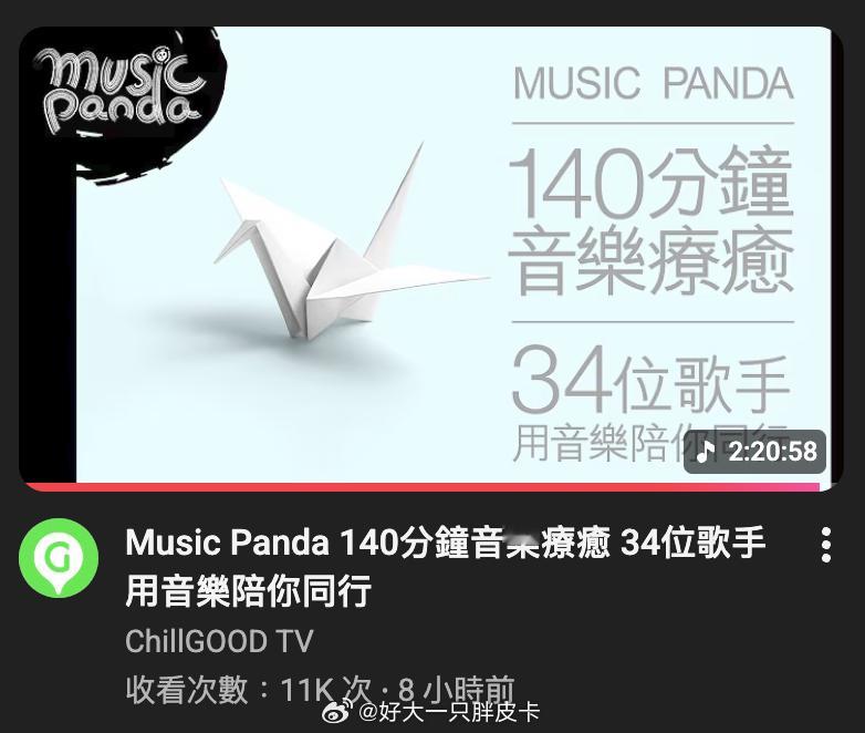 这几年一直关注的音乐节目《Music Panda》推出了一集140分钟的特别版。以音乐疗愈为主题,邀请了34位香港歌手共同录制了这一期无访谈Talk、只有疗愈歌曲的特别节目,以音乐陪你同行。完整节目🔗:(建议大家在官方Youtube专页观看,可以酌情打赏节目,ChillGOOD也会将捐出这两星期广告盈利,以及将本集节目内所收到所有观众打赏全数拨捐慈善机构,以继续支援受影响灾民。)网页链接『大埔宏福苑严重事故,令人震惊、悲痛。灾难造成很多悲剧,同时也给这座城市带来很多情绪的困堵。受灾者家人﹑亲友以及关心事件的市民都正在面对难以言喻的伤痛、无力和不安。我们希望音乐可以成为黑暗中温柔的微光,为大家带来一点点安慰,以纯粹的方式提供一种情绪的出口。为此,Music Panda诚邀众歌手朋友一同录制了一集没有访谈、只有疗愈歌曲为主题的特备节目。以音乐安抚受影响的居民、前线救援人员、受灾者家人、亲友及关注事件的市民,一同传递「灾难无情,香港有爱」的信念。以纯净歌声与简单伴奏,回归音乐最本真的疗愈力量。ChillGOOD亦将捐出这两星期广告盈利,以及将本集节目内所收到所有观众打赏全数拨捐慈善机构,以继续支援受影响灾民。』🎵歌单:01 莫文蔚-忽然之间02 卫兰-呼吸之间03 古巨基-时代04 陈蕾-重生(Cover 陈健安)05 Gigi炎明熹-记得(Cover 林家谦)06 梁咏琪-愿(Cover 林忆莲)07 Sinnie吴倩怡 -常愿意(Cover 刘天兰)08 Stephy邓丽欣 x Jay Fung冯允谦 x 陈健安 x Cloud云浩影 x Feanna黄淑蔓 x Van-今日(Cover 陈奕迅)09 Serrini-Let Us Go Then You And I 10 方皓玟-假使世界原来不像你预期 11 李幸倪Gin Lee-哭泣健康指南12 陈蕾-求救的勇气13 Alfred Hui许廷铿 -痛14 Kiri T x Gordon Flanders-强弱(Cover 邓小巧)15 Kiri T-伤心的时候别说话 16 moon tang-未来的歌17 陈健安 x Cloud云浩影-未知道18 KING吴祟铭 x SoulJase-留下来的人(Cover CAllStar)19 KING吴祟铭 x SoulJase-逾越生死(Cover CAllStar)20 吴浩康-吻弥留的你21 许靖韵-望年月22 冯允谦-会再见的23 邓丽欣-外面的世界(Cover 莫文蔚)24 梁钊峰-别消失25 陈柏宇-有我26 Feanna黄淑蔓 x Van-我在(Cover NowhereBoys)27 小肥-幸福之歌(Cover Supper Moment)28 6号x 小肥-逆光(Cover 孙燕姿)29 Cath黄妍-天光前30 恒仔ToNick )31 CY陈宗泽-每一个明天(Cover 陈奕迅)32 Phil林奕匡-一双手33 JW王灏儿-小故事 34 邓小巧-神爱世人 35 梁咏琪-陪着你走(Cover卢冠廷)