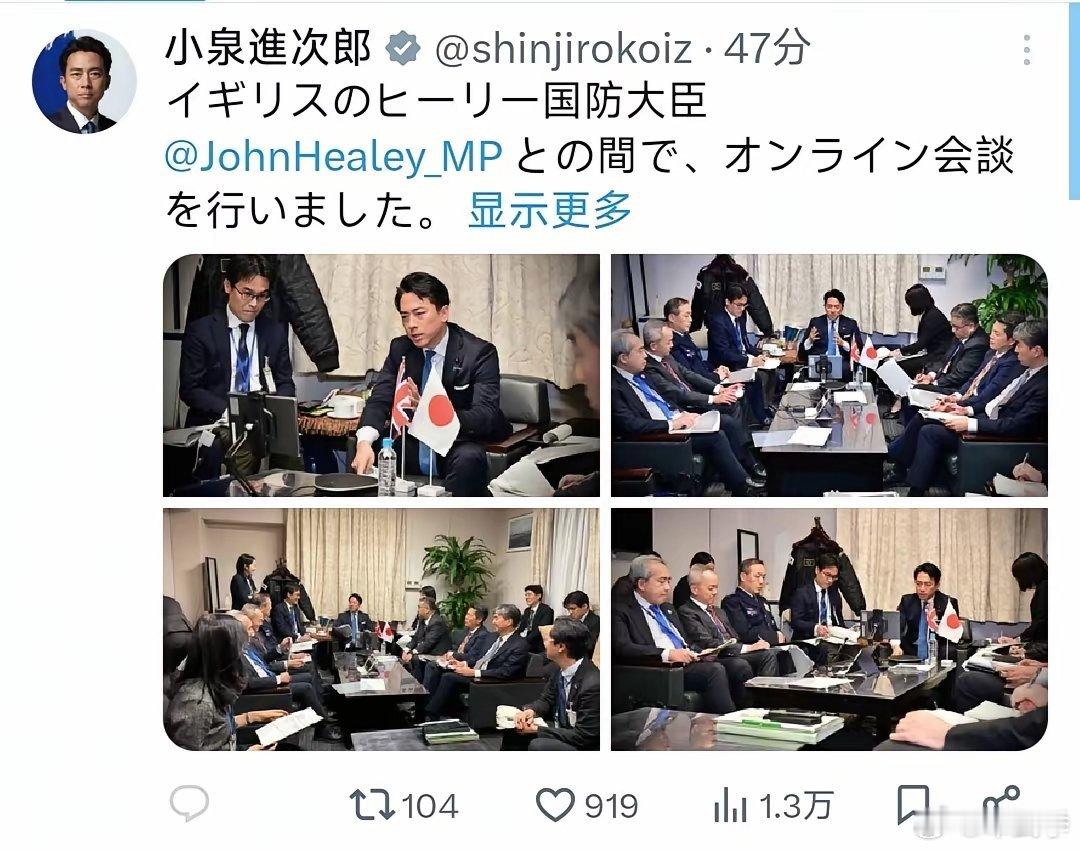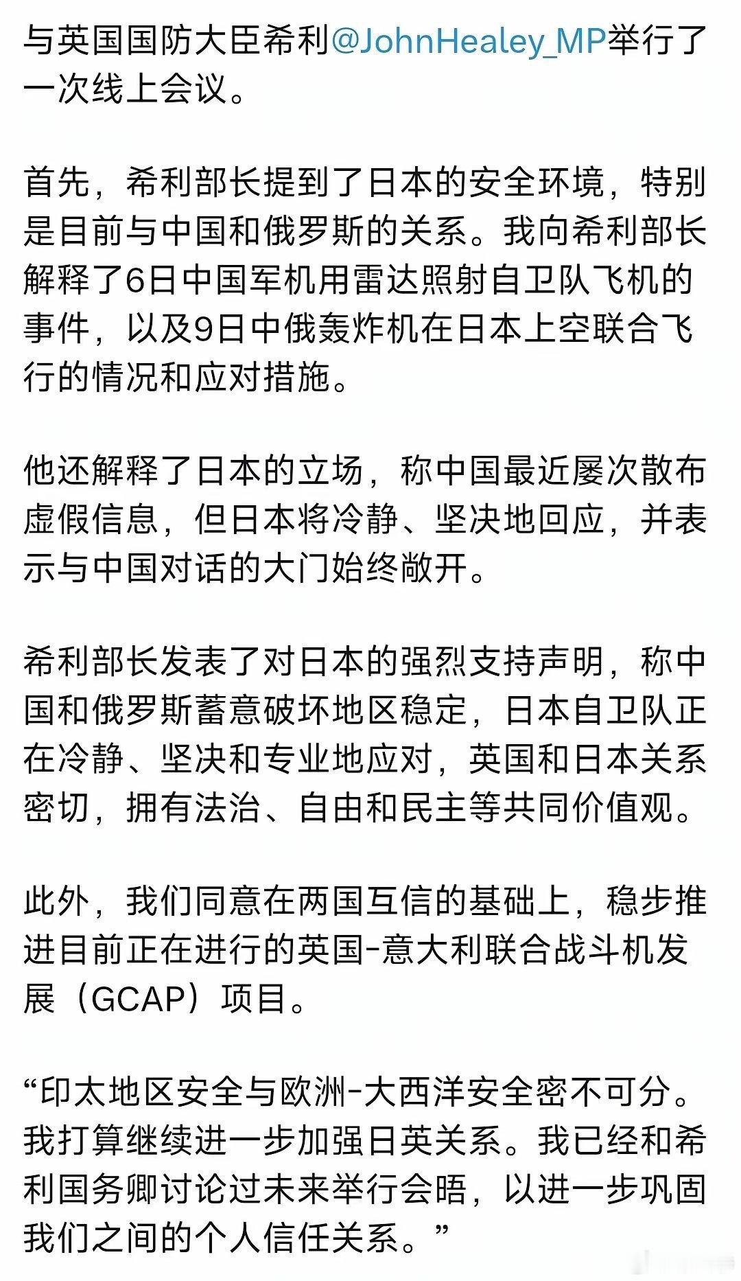 12月17号晚上,在德国、意大利、北约和美国之后,日本防卫大臣小泉进次郎又找到了第5位洋人告状,这人是英国防长黑利。 黑利表达了对日本的口头支持,称中俄破坏地区稳定,日本自卫队冷静、坚决和专业。