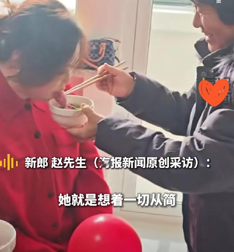 山东东营一对新人花1000元办极简婚礼!“酒店吃饭950元,囍字花了50元网上买的。”无车无房无彩礼,一切从简!12月16日,山东东营这对新人的婚礼火了! 新郎赵先生说:“她很随和,我说怎么弄她都没意见,只希望一切从简。我岳父岳父也没有向我提任何要求,房、车、彩礼都没有提。” 婚礼上,没有新娘的洁白婚纱,也没有新郎的笔挺西装。新娘穿着简简单单的红色上衣、黑色裤子,头发也没有做任何造型。新郎则是只穿着平常的衣服,没有任何的修饰。但二人的脸上,却带着满满的幸福! 接受记者采访时新娘说:“当初他和我商量大办婚礼,我说不办,啥也不办。”说到这儿,新娘突然笑了。 新娘的母亲则表示:“双方父母见面时,我能感觉到两家都是实在人。而小赵这孩子我也很喜欢,我觉得我姑娘跟着他能幸福。至于房、车、彩礼我觉得没必要,只要他们两个幸福,努力搞事业就行了。” 他们都觉得没有必要铺张浪费的去大办婚礼,不如省下那个钱给两个孩子搞事业。 赵先生从事广告行业,两三年前因业务相识,女方是他的客户。但是安装完门头后再也没联系,直到小赵去女方隔壁店铺装量尺寸,两人才又开始联系。 今年暑假两人才见面,按照女方家的风俗,中秋前要送礼去女方家,于是将双方父母见面的日子定在了八月初八,正好是赵先生的生日,女方父母还给赵先生准备了新手机。 什么样的婚姻才算幸福?不是腰缠万贯,更不是彩礼多少陪嫁多少。而是得到了父母祝福的婚姻才能幸福。祝赵先生和他的妻子百年好合、永结同心、一生幸福!