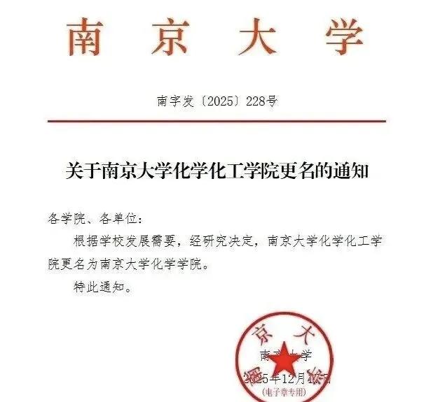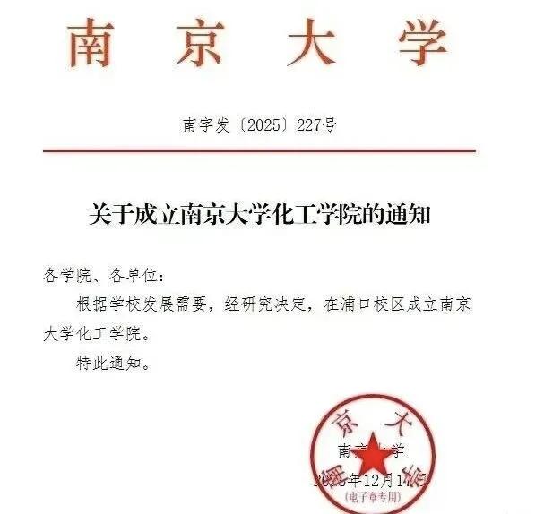 南京大学重磅成立两个新学院,全力发力新工科领域! 12月17日,南京大学发布文件,做出重大决定。一方面,在浦口校区成立化工学院,同时将化学化工学院更名为化学学院;另一方面,在成立南京大学先进制造学院。 以前,南大传统优势在理科,工科相对“短板”。通过新建两大工科学院,学校把原化学化工学院的工程部分离出来独立发展,同时新增制造学科,实现“理科—工程—产业”全链条布局,既释放基础学科潜力,又快速做大工程学科规模,提升综合竞争力。