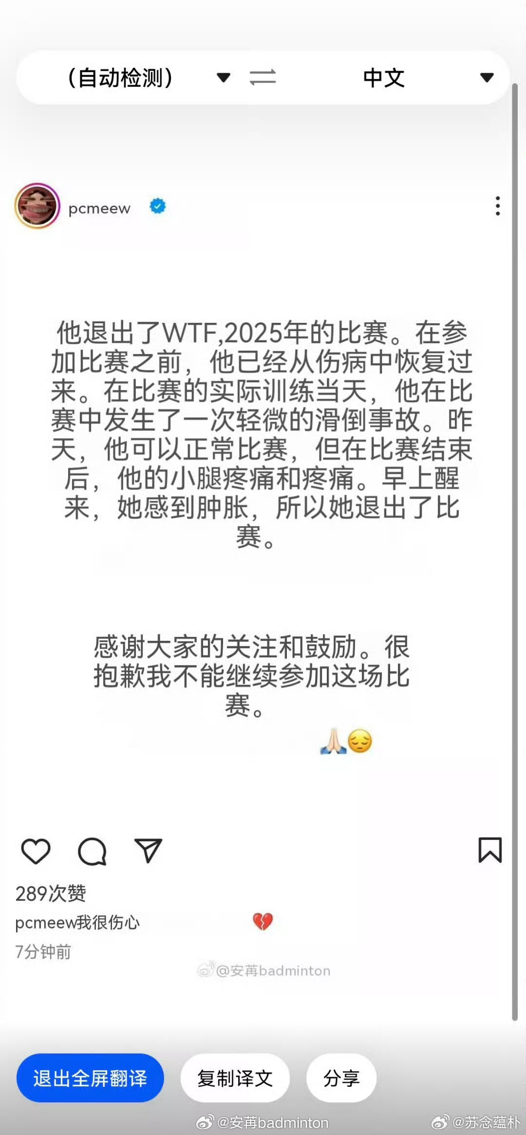 李美妙也第一时间发文了退赛缘由(图2为译文)李美妙:我已经退出2025年总决赛的比赛了。在来参加这场赛事前,就已经有受伤的状况了。到了赛事正赛当天,热身时出现了一点小意外,虽然当时还能正常参赛,但比赛结束后,我的左膝开始疼痛,到了第二天还出现了肿胀的情况,所以我只能退出这次比赛了。感谢每一位关注和为我加油的人,很抱歉这次无法继续参赛了🙏😔2025年世界羽联年终总决赛