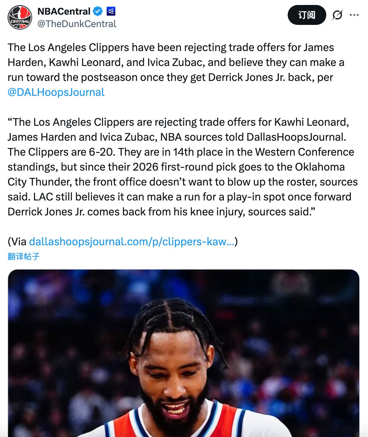 洛杉矶快船队一直在拒绝詹姆斯·哈登、科怀·伦纳德和伊维察·祖巴茨的交易报价,并相信一旦德里克·琼斯 Jr. 回归,他们就能向季后赛发起冲击