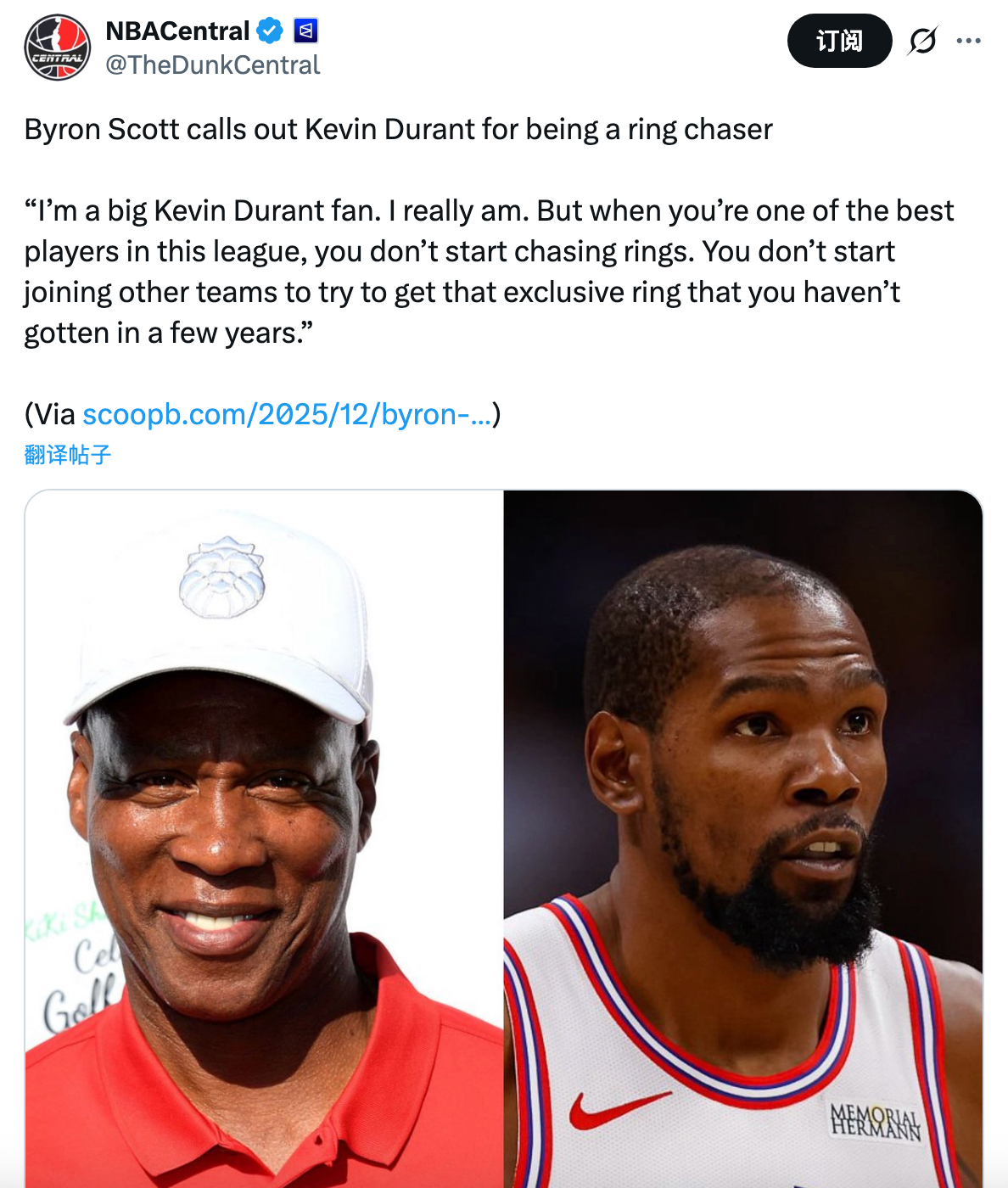 名宿拜伦·斯科特点名批评凯文·杜兰特是在“追逐总冠军戒指”。“我一直是凯文·杜兰特的忠实粉丝,真的。但当你已经是这个联盟里最顶级的球员之一时,你不该去追逐戒指。你不该为了拿到那枚自己这几年没拿到的‘独一无二的戒指’,而不断去加盟其他球队。”