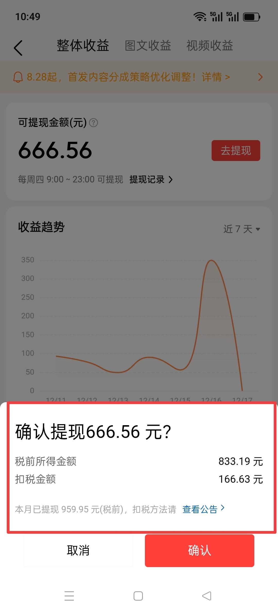 熬不住了!今天提现666元,这个数字还真吉利。税前833元,扣了166元的税。 这个礼拜,相比上次提现战绩要好很多。上星期提现了900多元,但却是2个星期加在一起的。 做自媒体就是这样,只要肯坚持,不断更,不急躁,不放弃,总会让你喝到汤。 作为一名普通的创作者来说,只要平均每天能保持3位数的收益,就已经成功了。 毕竟,现如今自媒体行业的红利已经过去。以往爆文,甚至大爆文随处可见。 单价亦是十分可观,每个月收入在大几千元的比比皆是。 但现在不一样了,每个月能够稳定在3000元到5000元之间,对于一个普通创作者来说已是极为难得了。 其实,自从自媒体红利褪去之后,以往好多和我同一期的拥有几十万粉丝的博主也退出了这个舞台。 有时候,想想还是挺孤独的。想当初,我们都组建了一个群,互相讨论学习,是何等的快哉。 可如今早已物是人非,走的走,散的散,大家各自用自己的方式去挣属于自身的一日三餐。 不过,在我看来,只要互联网存在,自媒体行业就不会消失。 只要坚持初心,或许未来之路会遇到各种各样的惊喜。 2025年,个人感觉是头条的活动年,各类活动不停,有门槛的,无条件的都有,这也是平台鼓励创作者的一种方式。 相信,2026年会有更多变化,甚至我觉得平台会在首发补贴上做更多的功课,让我们拭目以待。