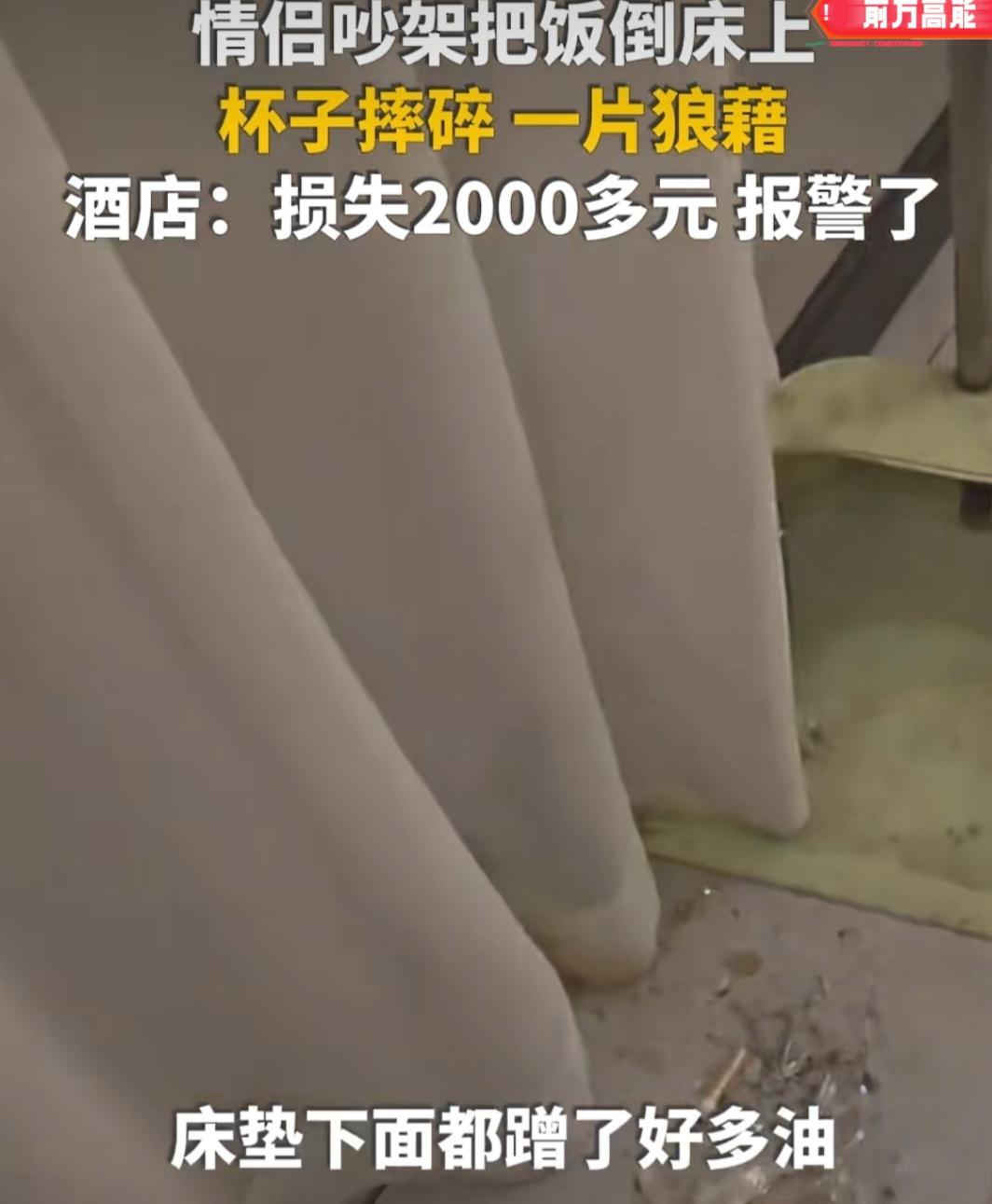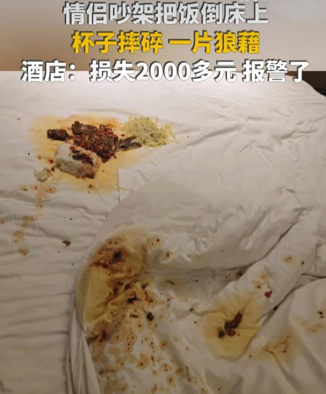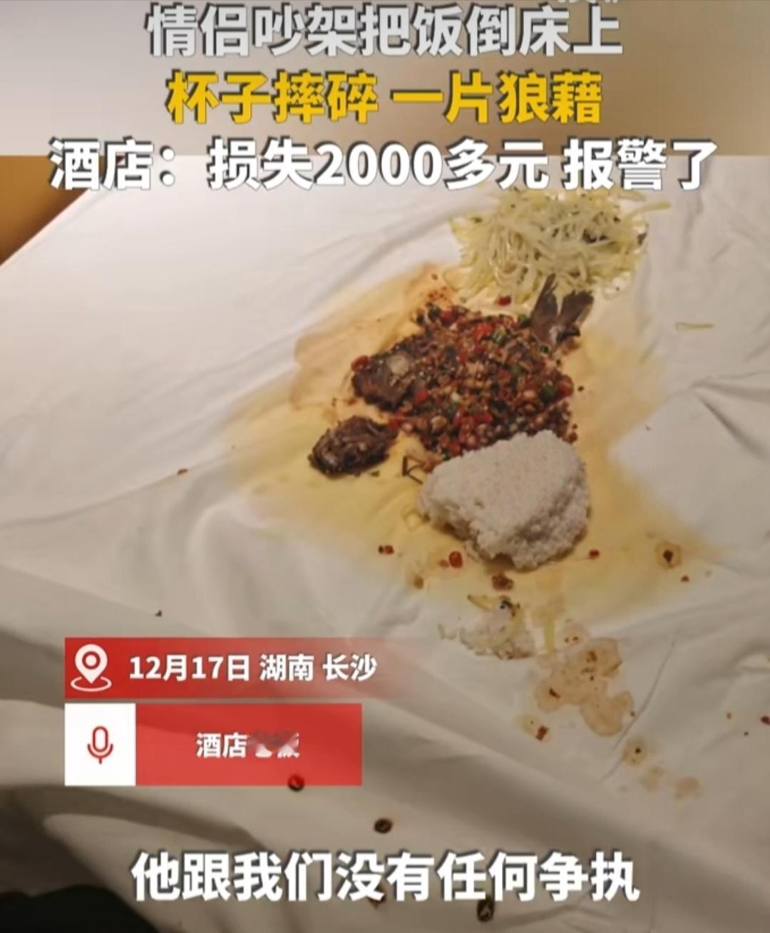 情侣酒店吵架,把饭菜倒床还摔杯跑路,酒店损失2000多元,老板愤怒报警! 12月17日湖南长沙,一对情侣住酒店时吵架,竟把饭菜全倒在床上,水杯也摔得粉碎,连沐浴露都被倒在浴室里,把房间造得一片狼藉。 酒店老板发现后直呼离谱,床单被子彻底没法用,床垫下都蹭了不少油污,算下来损失超2000元。更气人的是,这对情侣没退房就拿着房卡跑了。 老板无奈报警,警方联系上当事人后,对方却迟迟不回酒店处理。网友看了都忍不住吐槽:住店就得守规矩,再吵架也不能糟践别人东西,这钱必须赔!酒店吵架 长沙纠纷 情侣 酒店