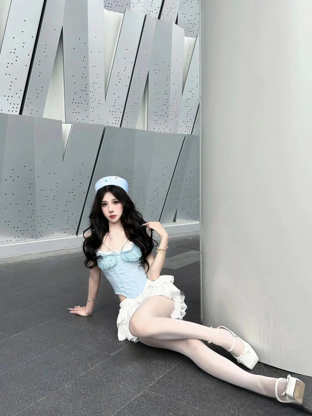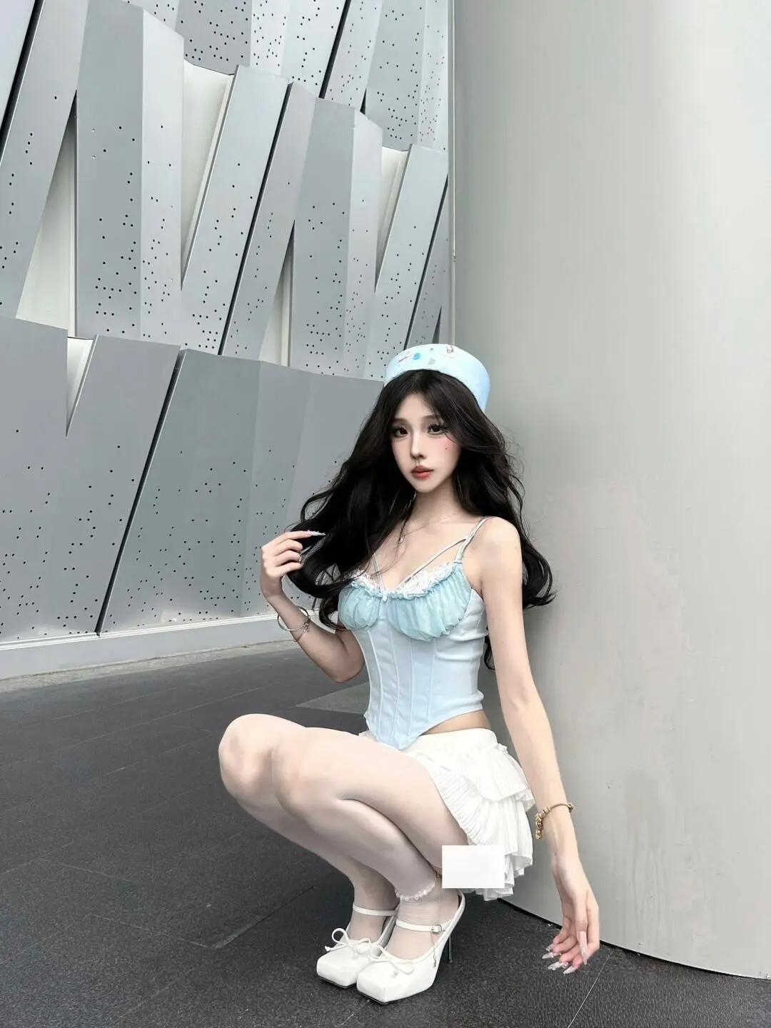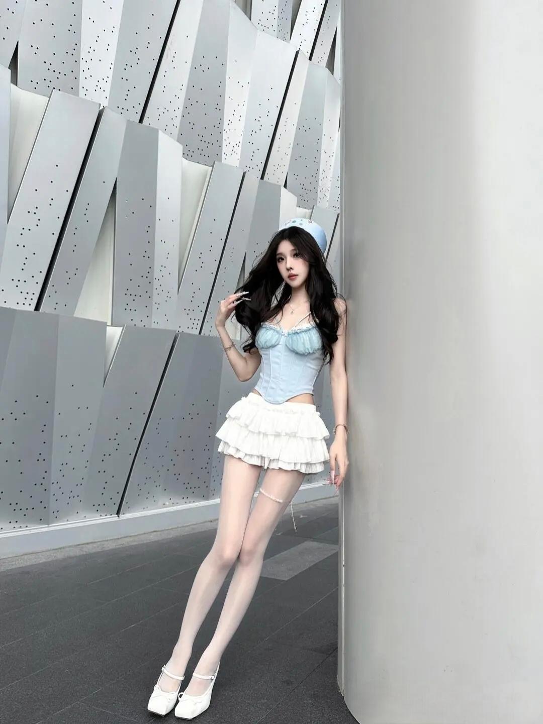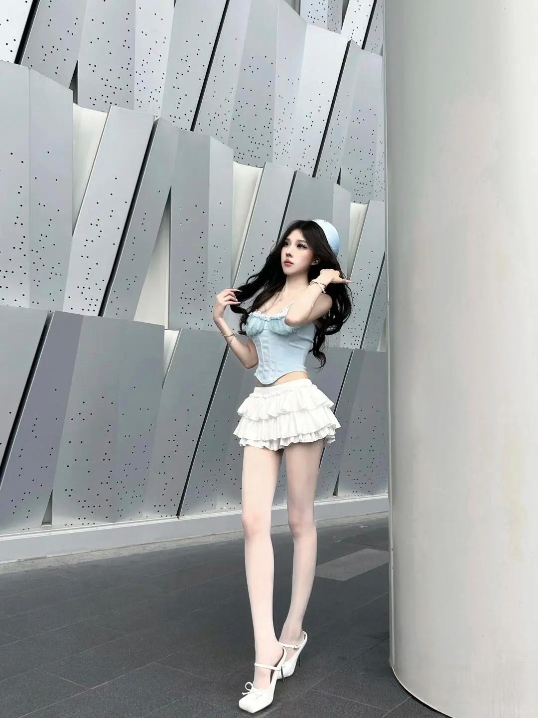 甜美少女风,浅蓝色连衣裙,白色高跟鞋,背景现代感十足。