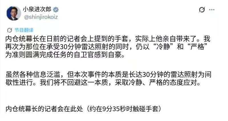 小泉继续炒作“雷达照射”事件,晒出飞行员手套卖惨,高市:可以坐下谈 16日,日