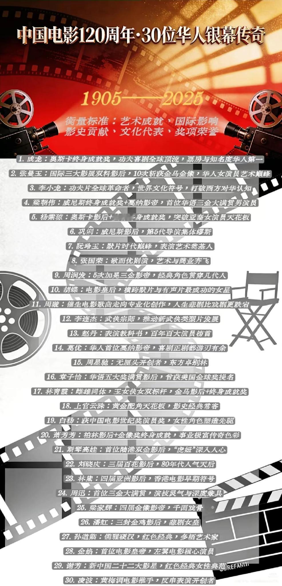 网友仿照好莱坞,评选出中国电影120周年30位银幕传奇。 1 、成龙 2、张曼玉 3、李小龙 4、梁朝伟 5、杨紫琼 6、巩俐 7、阮玲玉 8、张国荣 9、周润发 10、蝴蝶 我找来找去,周星驰和刘德华在哪里?原来周星驰在15位,这也太低了吧?至于刘德华,我还没找到。 至于女明星,很多我觉得虚高了,比如杨紫琼,除了一个奥斯卡,还有什么? 张曼玉凭啥比梁朝伟高?奖项作品都比不过啊!