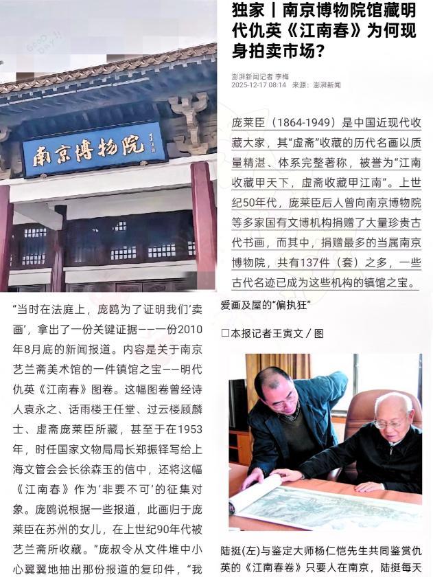 8800万,买断了三代人的信任! 当年庞家后人将137件传家宝无偿捐给南京博物院,图的不是名利,是信国家能护文脉周全。 可转头,仇英《江南春》就现身拍卖行,另外四件古画直接“失踪”。一句“伪作”就能随意剔除,一句“划拨调剂”就想蒙混过关,既拿不出鉴定依据,也没有流转单据,连捐赠方都懒得通知。 我承认你捐了文物,但没说文物是真的,后期做了“鉴定”认为你捐赠的文物是假的,所以我们就处理掉了,至于拍卖会上的东西我不知道也不清楚,其他涉及的文物等我想好了说辞再告诉你 庞家后人发觉,最愚蠢的事,就是把价值连城的藏品捐给国家,实际上是捐给素不相识的蛀虫! 这可是比盗窃还恶心吧,比流氓还流氓吧!这就是相信他们的结果,现在还能相信谁啊,俗话说除了爹娘不会伤害咱们,谁也不能相信。 别只盯着博物院这条线啊,拍卖行的拍品来源也要查!像这种大几千万的拍品,其来源一定是清晰明了有据可查。查深查透查清楚!另外下一步可能博物院要着火了,请加强防火巡查!