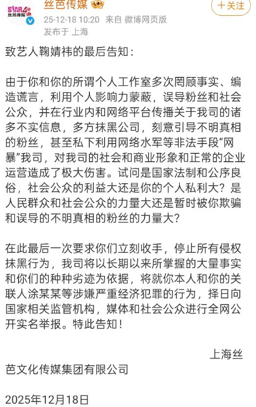 郭敬明最担心的事发生了! 丝芭传媒发文称手里有鞠婧祎长期经济犯罪的证据,郭敬明慌了,因为鞠婧祎是他未播出的新剧女主,如果鞠婧祎这时候出事了,这剧也就夭折了。 丝芭公司真的有得耐,早就曝光,不要等到现在,做人好聚好散嘛,人家帮你赚了这么多钱还不肯放过,丝芭真的吸血鬼来的。 应该是税务问题,打擦边球偷税漏税,这得公司配合。现在摇钱树要跑,公司要黄,就威胁同归于尽啊!这是一副要死一起死的节奏啊! 为了利益狗咬狗,谁是受害者?我们拭目以待,现在不要轻易下结论,坐等官方言论。